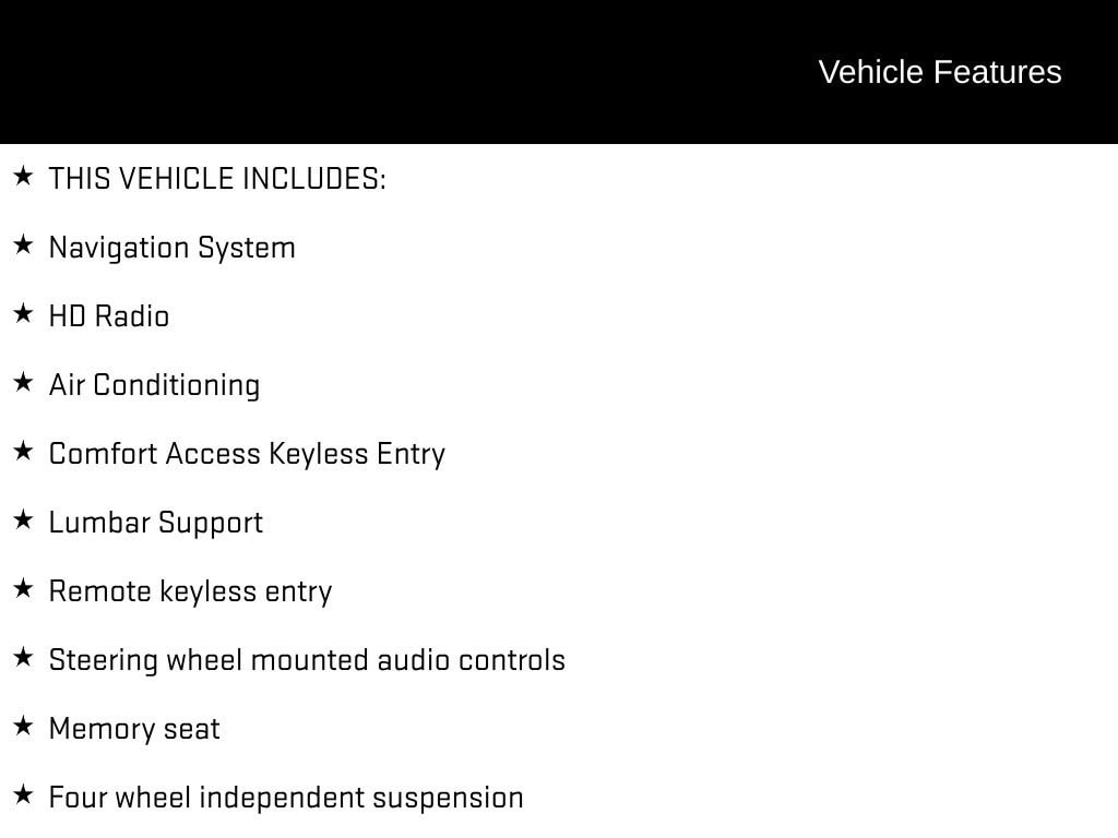 THIS VEHICLE INCLUDES:, 4-Wheel Disc Brakes, ABS brakes, Active Blind Spot Detection, Advanced Real-Time Traffic Information, Air Conditioning, Alloy wheels, Comfort Access Keyless Entry, Dual front impact airbags, Dual front side impact airbags, Four wheel independent suspension, Front Bucket Seats, Front Center Armrest, HD Radio, Heated Front Seats, Knee airbag, Low tire pressure warning, Lumbar Support, Memory seat, Moonroof, Navigation System, Occupant sensing airbag, Overhead airbag, Power Front Seats, Power passenger seat, Rain sensing wipers, Remote keyless entry, SensaTec Upholstery, Speed-sensing steering, Split folding rear seat, Sport Seats, Steering wheel mounted audio controls, Telescoping steering wheel, Tilt steering wheel, Traction control.