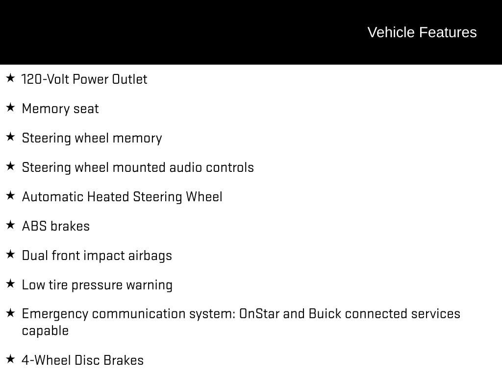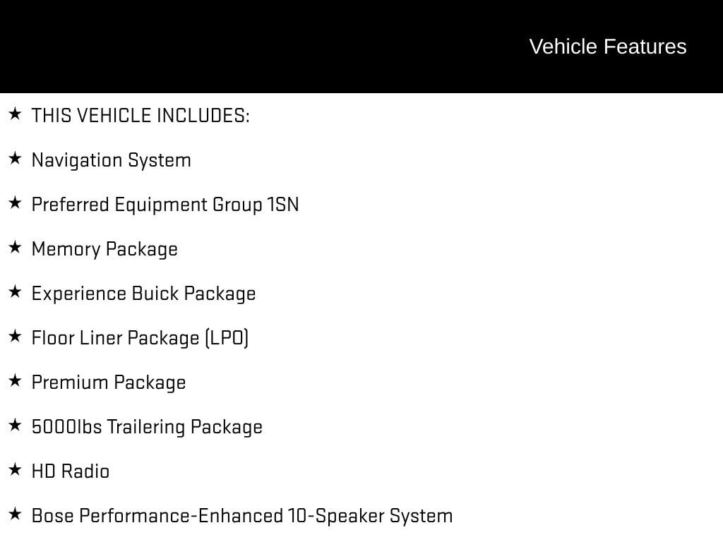 THIS VEHICLE INCLUDES:, FWD, 120-Volt Power Outlet, 1st & 2nd Row All-Weather Floor Liner (LPO), 20 Polished Aluminum Wheels, 3rd Row 60/40 Power Fold Split-Bench, 3rd Row All-Weather Floor Liner (LPO), 4-Wheel Disc Brakes, 5000lbs Trailering Package, 7-Passenger Seating, ABS brakes, Apple CarPlay/Android Auto, Auto High-beam Headlights, Auto tilt-away steering wheel, Auto-dimming door mirrors, Automatic Heated Steering Wheel, Bose Performance-Enhanced 10-Speaker System, Brake assist, Dual front impact airbags, Dual front side impact airbags, Emergency communication system: OnStar and Buick connected services capable, Experience Buick Package, Floor Liner Package (LPO), Front Bucket Seats, Front Power Sliding Moonroof, Fully automatic headlights, HD Radio, Heated 2nd Row Outboard Seats, Heated Driver & Front Passenger Seats, Heated front seats, Heated rear seats, Heated steering wheel, Heavy-Duty Cooling System, Integrated Cargo Liner (LPO), Leather steering wheel, Low tire pressure warning, Memory Package, Memory seat, Navigation System, Occupant sensing airbag, Outside Heated Power-Adjustable Mirrors, Overhead airbag, Power door mirrors, Power Driver Lumbar Control Seat Adjuster, Power Liftgate, Power Passenger Lumbar Control Seat Adjuster, Power Tilt & Telescopic Steering Column, Preferred Equipment Group 1SN, Premium Package, Roof rack: rails only, Security system, Steering wheel memory, Steering wheel mounted audio controls, Tilt steering wheel, Trip computer, Ventilated Driver & Front Passenger Seats.