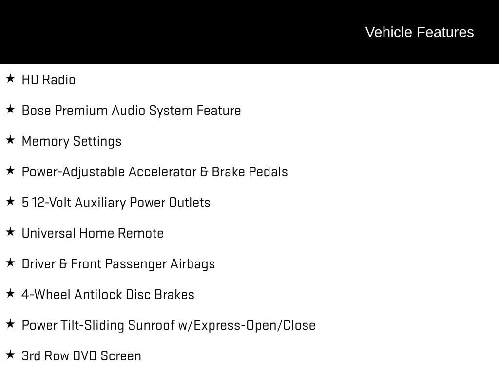 - Overhead airbags : Curtain first, second and third-row overhead airbags