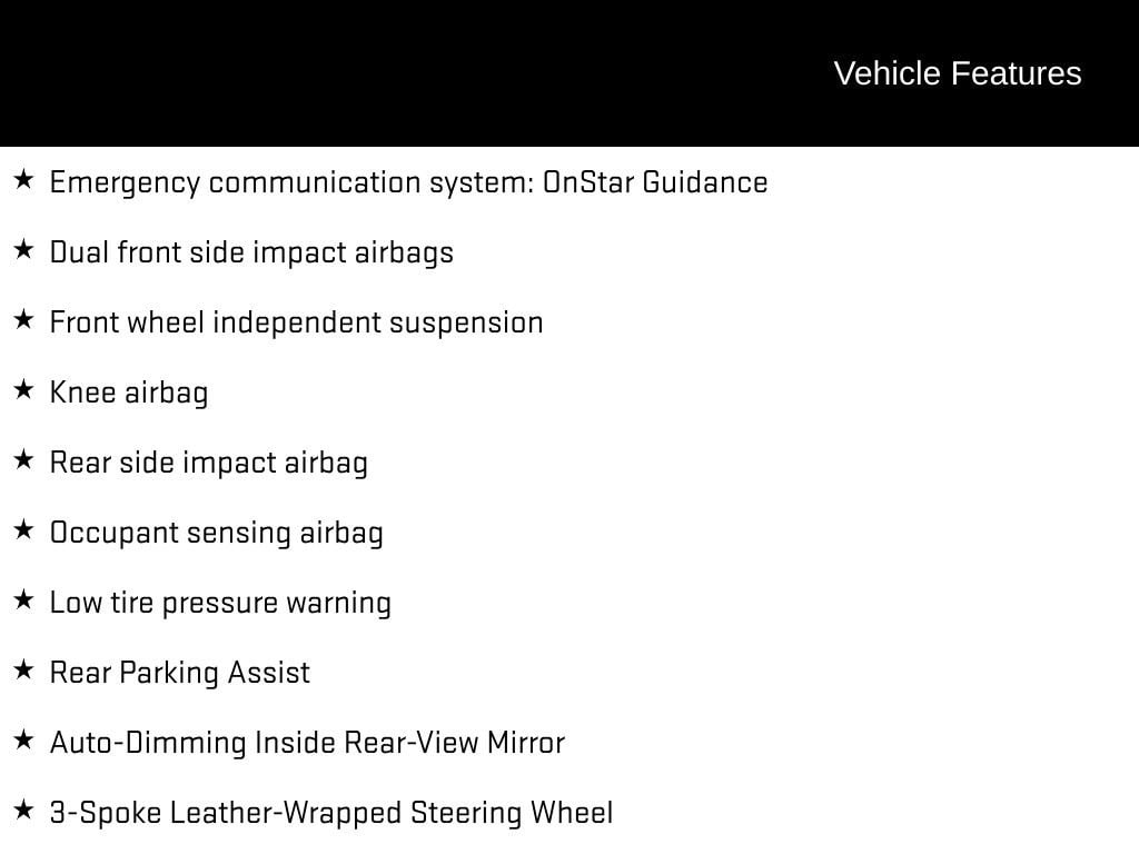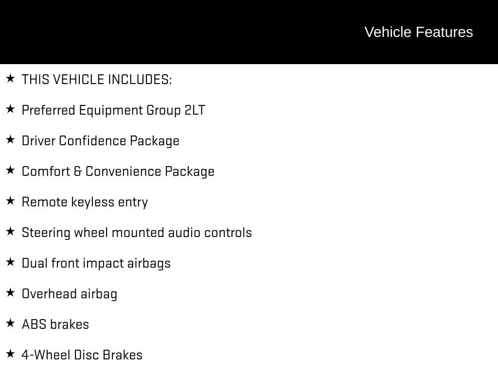THIS VEHICLE INCLUDES:, 3-Spoke Leather-Wrapped Steering Wheel, 4-Wheel Disc Brakes, ABS brakes, Alloy wheels, Auto-Dimming Inside Rear-View Mirror, Comfort & Convenience Package, Driver Confidence Package, Dual front impact airbags, Dual front side impact airbags, Emergency communication system: OnStar Guidance, Front wheel independent suspension, Heated Driver & Front Passenger Seats, Heated Steering Wheel, Knee airbag, Lane Change Alert w/Side Blind Zone Alert, Low tire pressure warning, Occupant sensing airbag, Overhead airbag, Preferred Equipment Group 2LT, Rear Cross-Traffic Alert, Rear Parking Assist, Rear side impact airbag, Remote keyless entry, Steering wheel mounted audio controls.