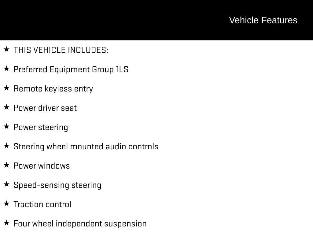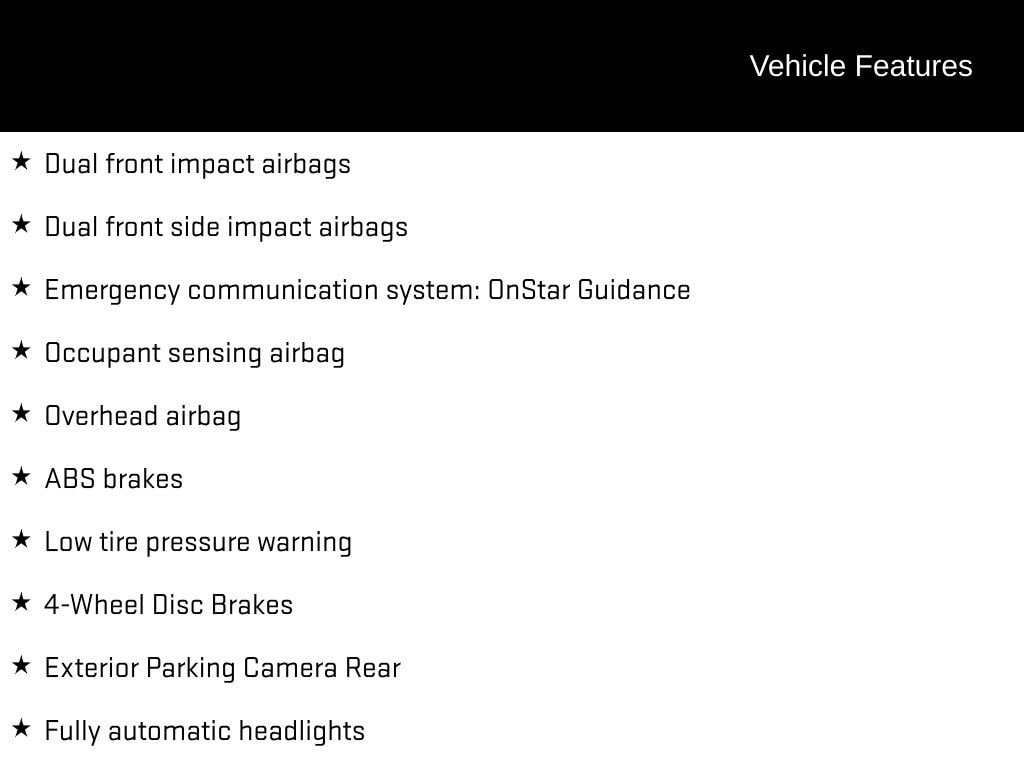 THIS VEHICLE INCLUDES:, 4-Wheel Disc Brakes, ABS brakes, Alloy wheels, Compass, Deluxe Front Bucket Seats, Driver vanity mirror, Dual front impact airbags, Dual front side impact airbags, Emergency communication system: OnStar Guidance, Exterior Parking Camera Rear, Four wheel independent suspension, Front Bucket Seats, Fully automatic headlights, Low tire pressure warning, Occupant sensing airbag, Overhead airbag, Power driver seat, Power steering, Power windows, Preferred Equipment Group 1LS, Remote keyless entry, Speed-sensing steering, Steering wheel mounted audio controls, Telescoping steering wheel, Tilt steering wheel, Traction control.