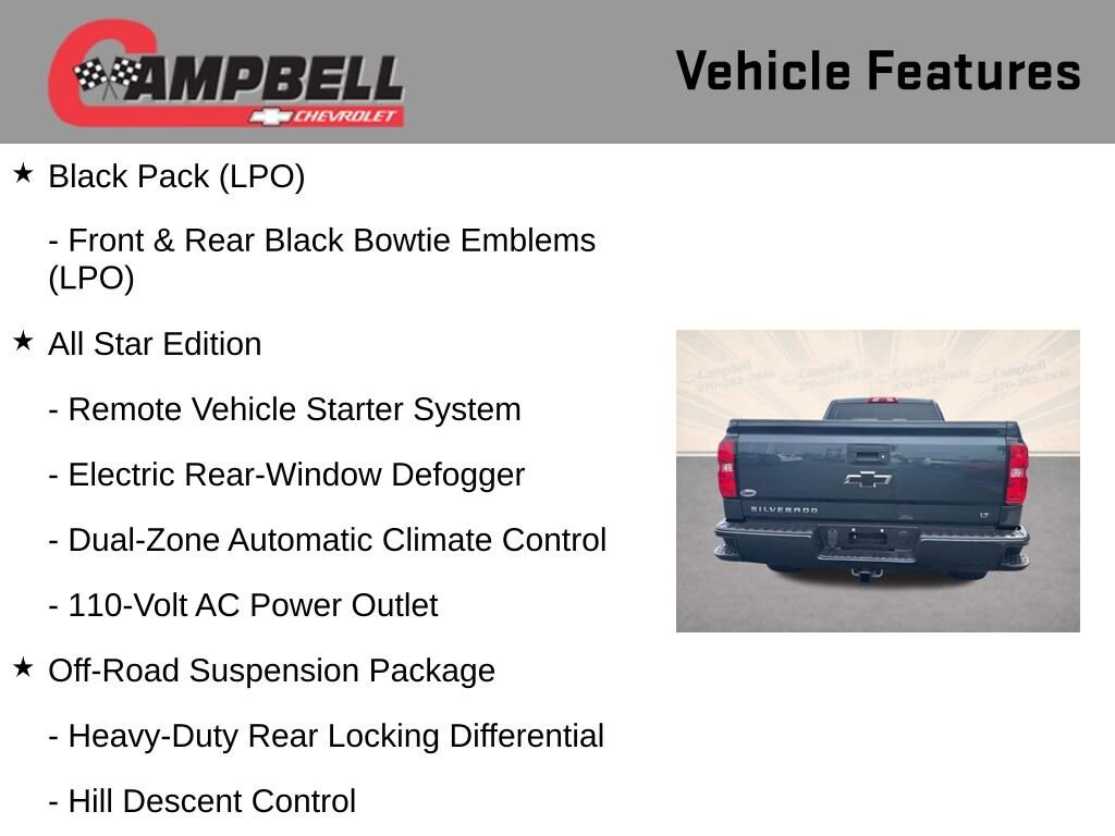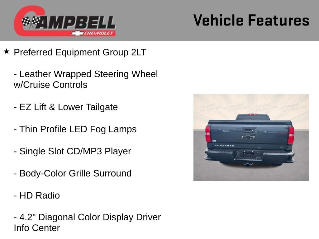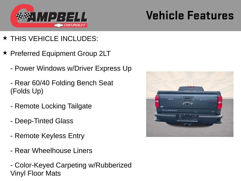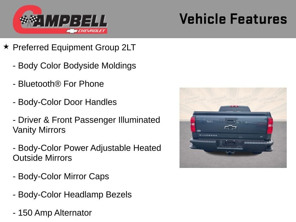 Discover the power and capability of the 2018 Chevrolet Silverado 1500 LT LT2. This impressive truck is equipped with a robust EcoTec3 5.3L V8 engine, delivering exceptional performance and efficiency. With its 4-wheel drive system and off-road-ready features, this Silverado is ready to conquer any terrain, whether you're tackling tough job sites or embarking on thrilling adventures.This Silverado LT LT2 comes loaded with an impressive array of features, including:- Black Pack (LPO) - Featuring 22 5-spoke high-gloss Black wheels, 4 round Black tubular assist steps, and Black Bow-Tie emblems for a bold, distinctive look.- All Star Edition - Includes driver 10-way power seat adjuster, dual-zone climate control, remote vehicle starter system, and more.- LPO Bed Liner and All-Weather Floor Liner - Protecting your investment and keeping your Silverado looking its best.- LED Lighting in the Cargo Box - Providing convenient illumination when you need it most.- Trailering Package - Equipping your Silverado with the tools to tow with confidence.Step inside and you'll be surrounded by premium amenities, such as a Leather-Wrapped Steering Wheel with Cruise Controls, Dual-Zone Automatic Climate Control, and a 110-Volt AC Power Outlet. Stay connected with the Chevrolet MyLink infotainment system, featuring a large 8 Diagonal Color Touch Screen, SiriusXM Satellite Radio, and Bluetooth® for phone connectivity.This Silverado also boasts a wealth of advanced safety features, including Theft Deterrent System, Hill Descent Control, and a Rear Vision Camera, giving you peace of mind on every journey.With its impressive capabilities, premium features, and bold styling, the 2018 Chevrolet Silverado 1500 LT LT2 is the perfect choice for those seeking a versatile and capable truck that can handle any task or adventure. Visit our showroom today and experience the power and performance of this exceptional Silverado for yourself.