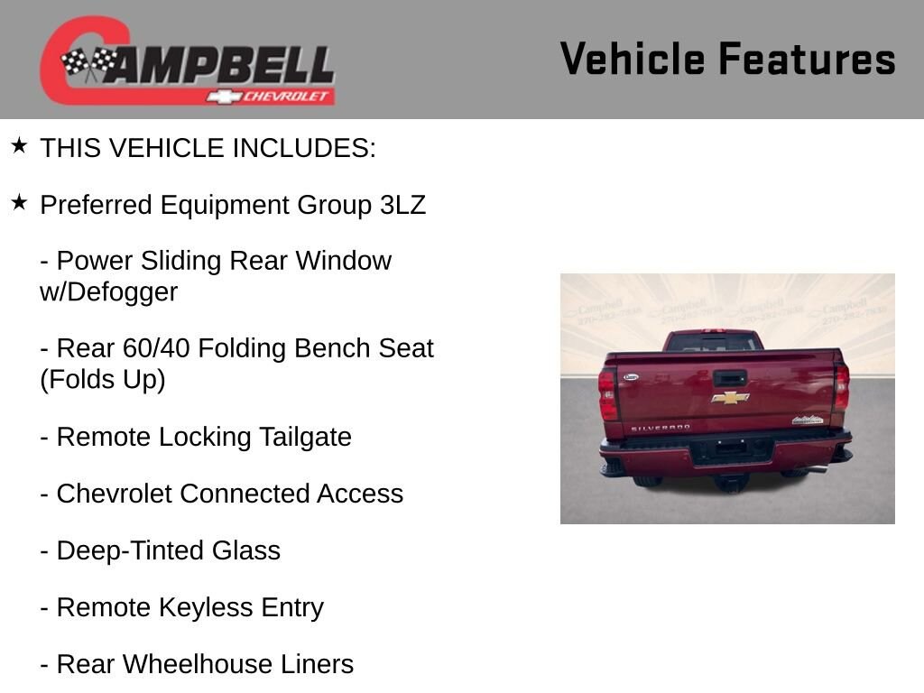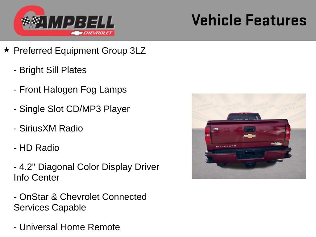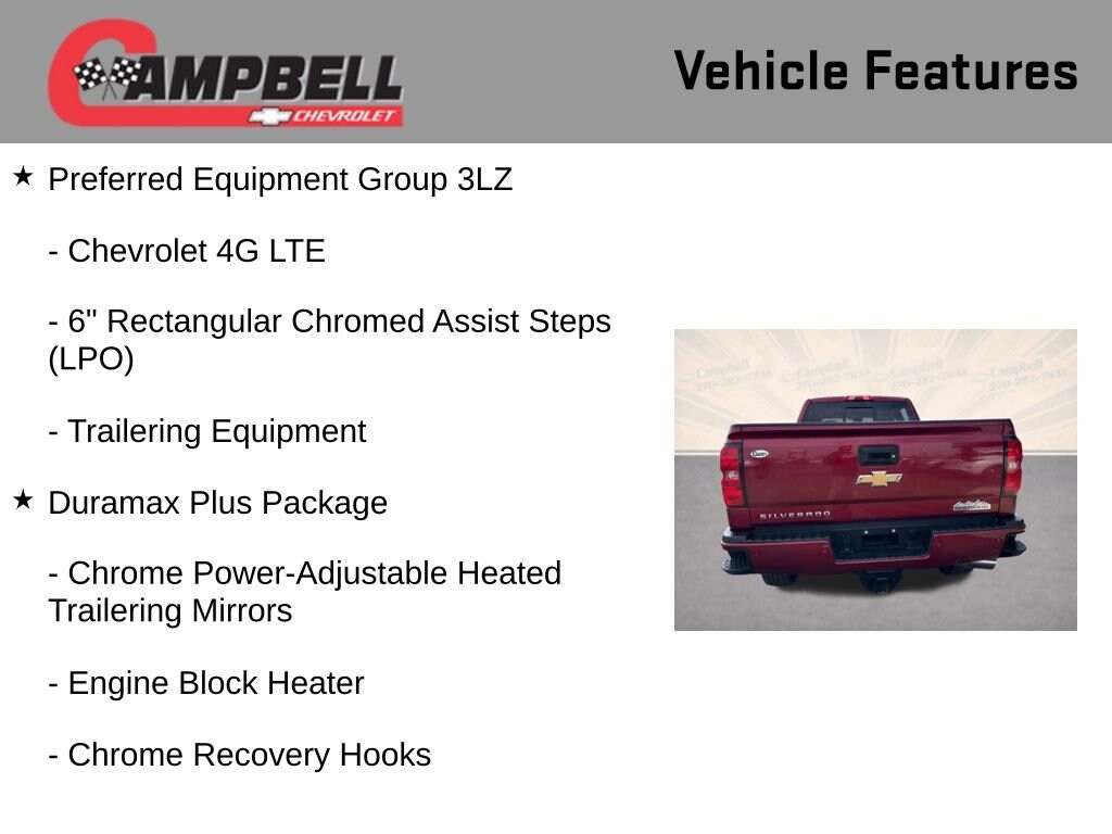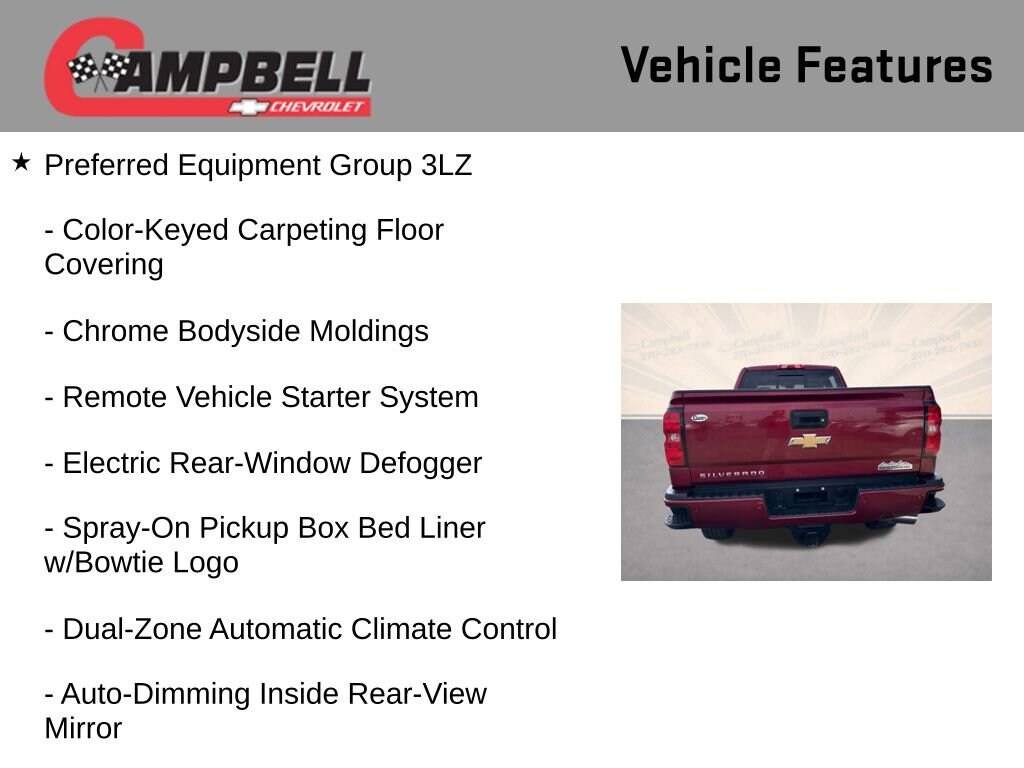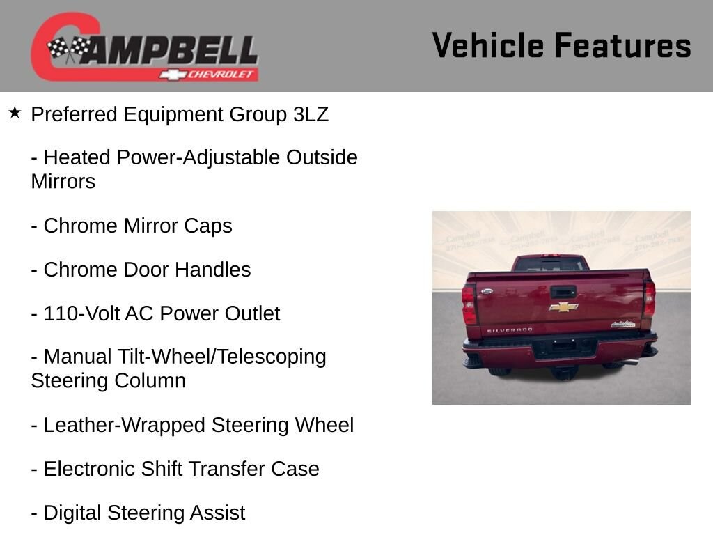 Introducing the 2019 Chevrolet Silverado 2500HD High Country - a commanding presence on the road and a true workhorse in the field. With its imposing Duramax 6.6L V8 Turbodiesel engine and Allison 1000 6-speed automatic transmission, this heavy-duty pickup delivers unparalleled power and capability. Adorned in a stunning Cajun Red Tintcoat exterior, this Silverado High Country exudes an air of refined sophistication.- DURAMAX PLUS PACKAGE: Includes the powerful Duramax 6.6L Turbo-Diesel V8 engine, Allison 1000 6-speed automatic transmission, and a host of other enhancements to elevate your driving experience.- SUNROOF, POWER: Enjoy the open skies above with the touch of a button.- SMOKED AMBER ROOF MARKER LAMPS: A distinctive touch that adds to the Silverado's bold, commanding presence.Beyond its impressive capabilities, this Silverado High Country is packed with an array of premium features designed to make your driving experience more comfortable, convenient, and connected. From the heated and ventilated front seats to the Bose sound system and integrated navigation, every detail has been thoughtfully considered to elevate your time behind the wheel.As you settle into the plush, perforated leather-appointed seating, you'll be surrounded by a wealth of advanced technologies. The Chevrolet Infotainment System with Navigation keeps you connected and entertained, while the Driver Alert Package and Forward Collision Alert help you stay safe on the road. The Rear Camera and Ultrasonic Front and Rear Park Assist make navigating tight spaces a breeze, while the Integrated Trailer Brake Controller ensures seamless towing.The Silverado High Country's impressive capabilities are matched by its refined, premium styling. The chrome exterior accents, including the power-adjustable heated trailering mirrors and recovery hooks, add a touch of elegance to this powerful workhorse. The 20-inch chromed aluminum wheels further enhance the Silverado's commanding presence, while the spray-on bedliner and movable upper cargo tie-downs ensure your cargo is secure and protected.Whether you're tackling tough jobs or embarking on grand adventures, the 2019 Chevrolet Silverado 2500HD High Country is the perfect companion. Blending uncompromising capability with unparalleled comfort and convenience, this remarkable vehicle is ready to elevate your driving experience to new heights. We invite you to visit our showroom and experience the power and refinement of the Silverado High Country for yourself.