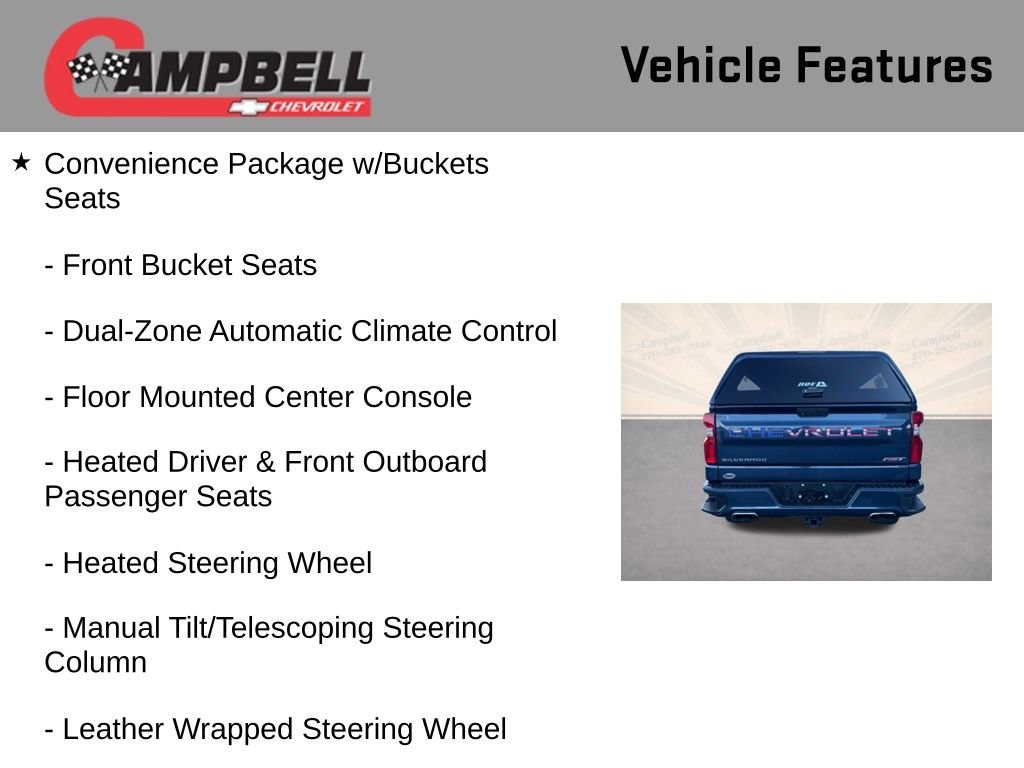 Inside, the Silverado RST pampers you with a host of premium features. Slide into the comfortable, heated, and power-adjustable front bucket seats, and enjoy the convenience of the Chevrolet Infotainment 3 Plus system with an 8-inch touchscreen, SiriusXM with 360L, and a Bose premium sound system. The dual-zone automatic climate control, heated steering wheel, and power-sliding rear window add to the overall comfort and convenience.