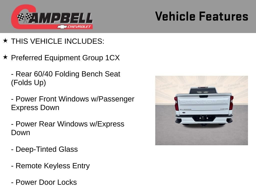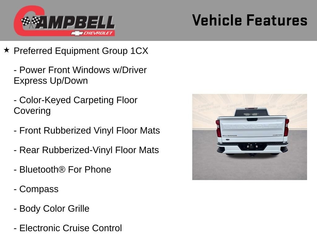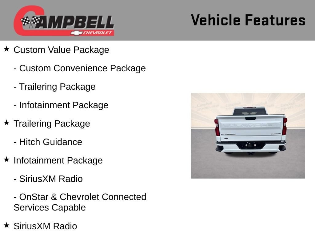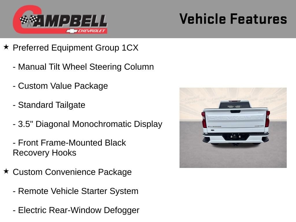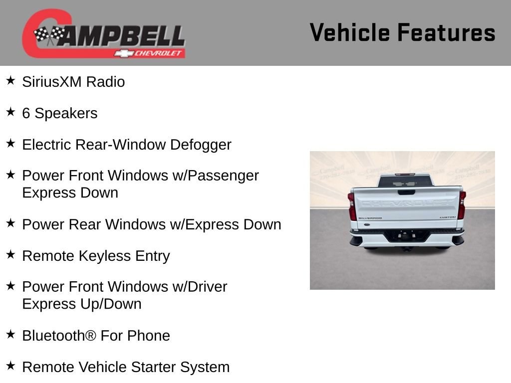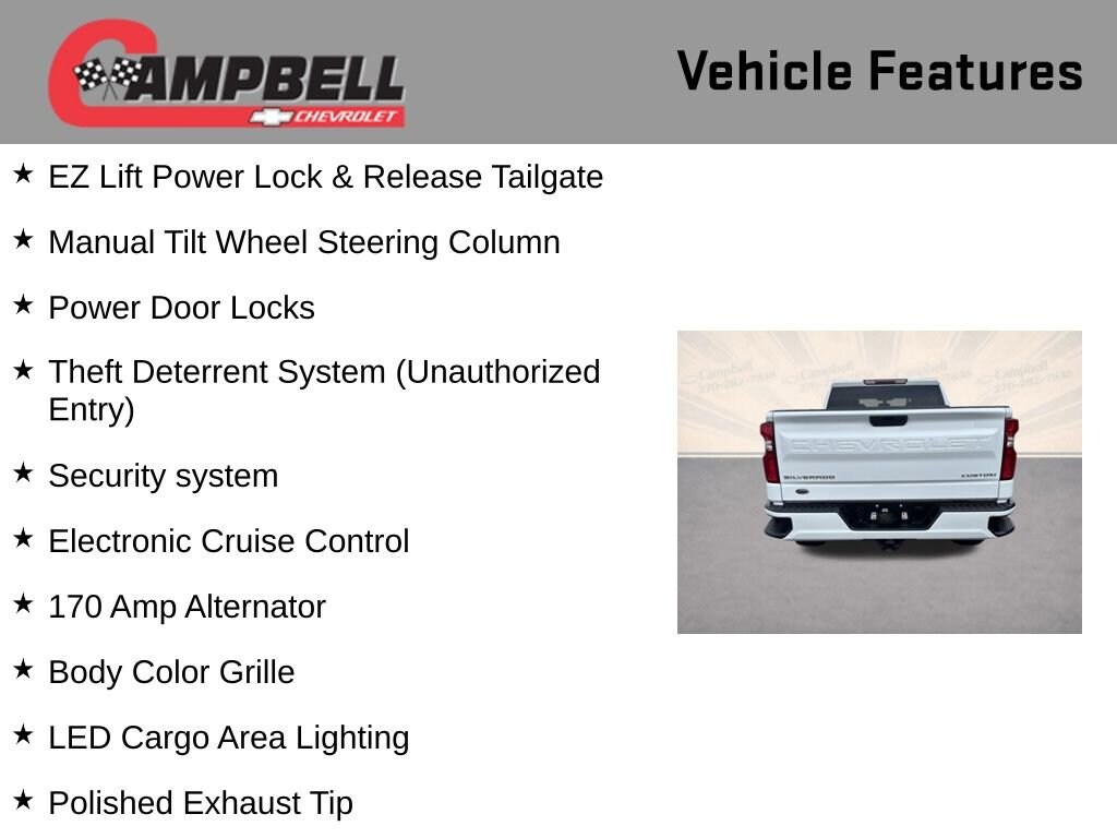 THIS VEHICLE INCLUDES:, 6-Speed Automatic Electronic with Overdrive, Black Cloth, 170 Amp Alternator, 3.5 Diagonal Monochromatic Display, 4G LTE Wi-Fi Hot Spot Capable, 6 Speakers, Bluetooth® For Phone, Body Color Grille, Chevrolet Connected Access Capable, Color-Keyed Carpeting Floor Covering, Compass, Custom Convenience Package, Custom Value Package, Deep-Tinted Glass, Electric Rear-Window Defogger, Electronic Cruise Control, EZ Lift Power Lock & Release Tailgate, Front Frame-Mounted Black Recovery Hooks, Front Rubberized Vinyl Floor Mats, Hitch Guidance, Infotainment Package, LED Cargo Area Lighting, Manual Tilt Wheel Steering Column, OnStar & Chevrolet Connected Services Capable, Polished Exhaust Tip, Power Door Locks, Power Front Windows w/Driver Express Up/Down, Power Front Windows w/Passenger Express Down, Power Rear Windows w/Express Down, Preferred Equipment Group 1CX, Rear 60/40 Folding Bench Seat (Folds Up), Rear Rubberized-Vinyl Floor Mats, Remote Keyless Entry, Remote Vehicle Starter System, Security system, SiriusXM Radio, Standard Tailgate, Theft Deterrent System (Unauthorized Entry), Trailering Package.