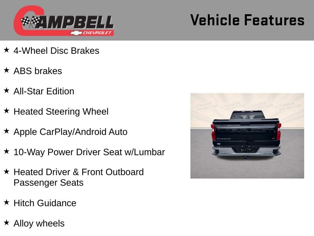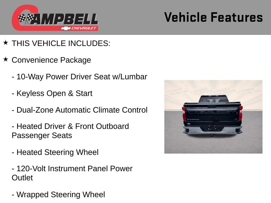 This Silverado LT is equipped with a wealth of features that make every drive more comfortable, convenient, and connected. The Chevrolet Infotainment 3 Premium system with wireless Apple CarPlay and Android Auto integration keeps you entertained and connected on the go, while the Dual-Zone Automatic Climate Control ensures you and your passengers stay perfectly comfortable. The Heated Steering Wheel and Heated Front Seats provide a luxurious touch, making cold mornings a breeze.