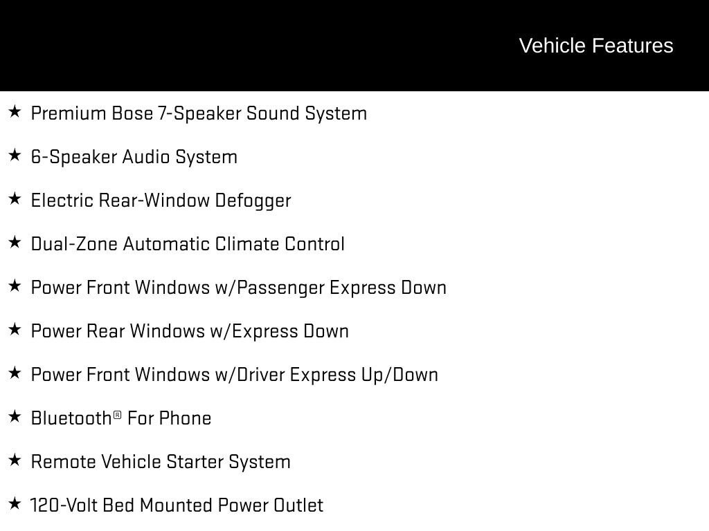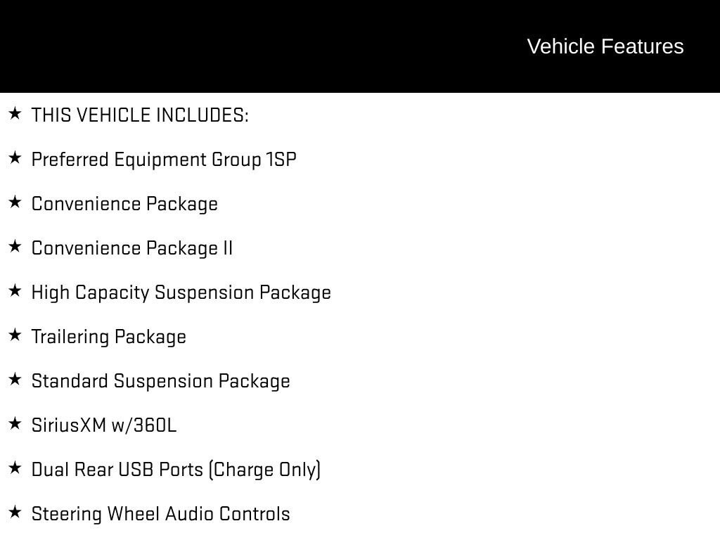 THIS VEHICLE INCLUDES:, 10-Speed Automatic, 4WD, Black Cloth, 10-Way Power Driver Seat w/Lumbar, 12.3 Multicolor Reconfigurable Digital Display, 120-Volt Bed Mounted Power Outlet, 120-Volt Interior Power Outlet, 6-Speaker Audio System, All-Star Edition, Auto-Locking Rear Differential, Bluetooth® For Phone, Chevrolet Connected Access Capable, Color-Keyed Carpeting Floor Covering, Convenience Package, Convenience Package II, Deep-Tinted Glass, Dual Rear USB Ports (Charge Only), Dual-Zone Automatic Climate Control, Electric Rear-Window Defogger, Electrical Steering Column Lock, Electronic Cruise Control, EZ Lift Power Lock & Release Tailgate, Front Frame-Mounted Black Recovery Hooks, Front LED Fog Lamps, Front Rubberized Vinyl Floor Mats, HD Rear Vision Camera, Heated Driver & Front Outboard Passenger Seats, Heated Power-Adjustable Outside Mirrors, Heated Steering Wheel, High Capacity Suspension Package, High Gloss Black Mirror Caps, Hitch Guidance, Hitch Guidance w/Hitch View, In-Vehicle Trailering System App, Inside Rear-View Mirror w/Tilt, Integrated Trailer Brake Controller, Keyless Open & Start, LED Cargo Area Lighting, OnStar & Chevrolet Connected Services Capable, Power Front Windows w/Driver Express Up/Down, Power Front Windows w/Passenger Express Down, Power Rear Windows w/Express Down, Power Sliding Rear Window w/Rear Defogger, Preferred Equipment Group 1SP, Premium Bose 7-Speaker Sound System, Rear 60/40 Folding Bench Seat (Folds Up), Rear Rubberized-Vinyl Floor Mats, Remote Vehicle Starter System, SiriusXM w/360L, Standard Suspension Package, Standard Tailgate, Steering Wheel Audio Controls, Theft Deterrent System (Unauthorized Entry), Trailering Package, Universal Home Remote, Wi-Fi Hot Spot Capable, Wrapped Steering Wheel.
