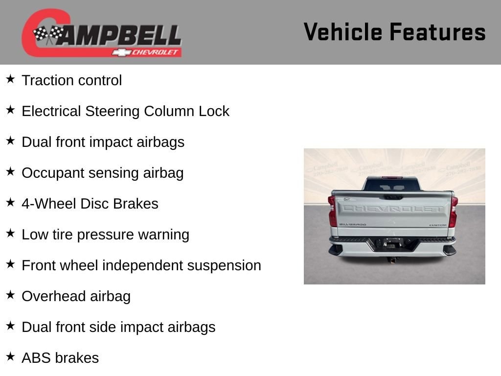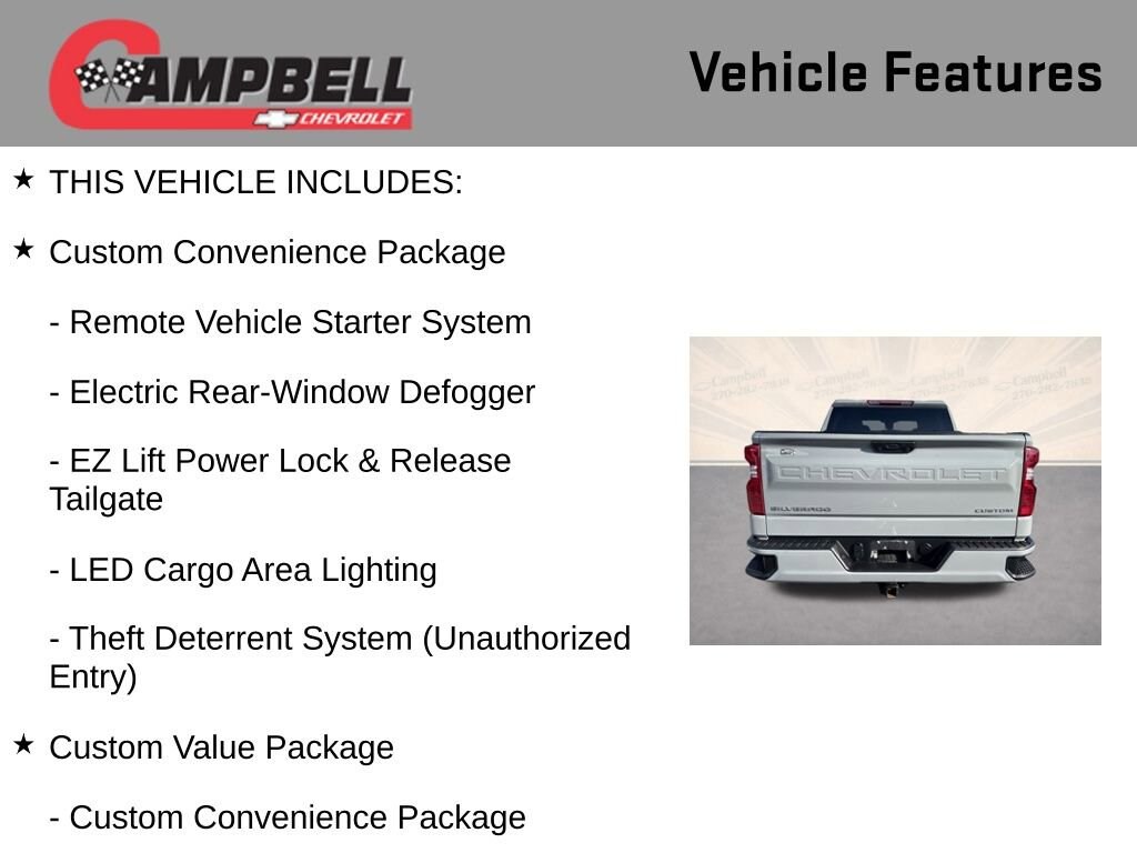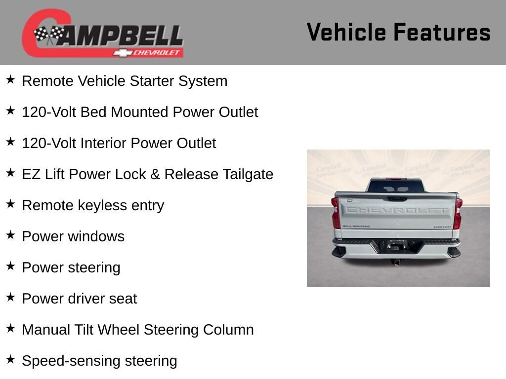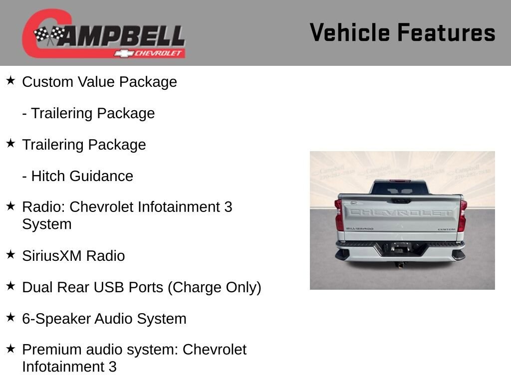THIS VEHICLE INCLUDES:, 8-Speed Automatic, 4WD, Black Cloth, 10-Way Power Driver Seat w/Lumbar, 120-Volt Bed Mounted Power Outlet, 120-Volt Interior Power Outlet, 3.42 Rear Axle Ratio, 3.5 Monochromatic Display Driver Info Center, 4-Wheel Disc Brakes, 40/20/40 Front Split-Bench Seat, 6-Speaker Audio System, ABS brakes, Air Conditioning, Alloy wheels, AM/FM radio: SiriusXM, Auto High-beam Headlights, Automatic Emergency Braking, Bluetooth® For Phone, Brake assist, Bumpers: body-color, Chevrolet Connected Access Capable, Cloth Seat Trim, Color-Keyed Carpeting Floor Covering, Compass, Custom Convenience Package, Custom Value Package, Deep-Tinted Glass, Delay-off headlights, Driver door bin, Driver vanity mirror, Dual front impact airbags, Dual front side impact airbags, Dual Rear USB Ports (Charge Only), Electric Rear-Window Defogger, Electrical Steering Column Lock, Electronic Cruise Control, Electronic Stability Control, EZ Lift Power Lock & Release Tailgate, Following Distance Indicator, Forward Collision Alert, Front anti-roll bar, Front Center Armrest w/Storage, Front Frame-Mounted Black Recovery Hooks, Front Pedestrian Braking, Front wheel independent suspension, Fully automatic headlights, Heated door mirrors, Hitch Guidance, IntelliBeam Automatic High Beam On/Off, LED Cargo Area Lighting, Low tire pressure warning, Manual Tilt Wheel Steering Column, Occupant sensing airbag, Overhead airbag, Panic alarm, Passenger door bin, Power door mirrors, Power driver seat, Power Front Windows w/Driver Express Up/Down, Power Front Windows w/Passenger Express Down, Power Rear Windows w/Express Down, Power steering, Power windows, Premium audio system: Chevrolet Infotainment 3, Radio data system, Radio: Chevrolet Infotainment 3 System, Rear 60/40 Folding Bench Seat (Folds Up), Rear step bumper, Rear window defroster, Remote Keyless Entry, Remote keyless entry, Remote Vehicle Starter System, Security system, Single Outlet Exhaust, SiriusXM Radio, Speed control, Speed-sensing steering, Split folding rear seat, Standard Tailgate, Theft Deterrent System (Unauthorized Entry), Traction control, Trailering Package, Variably intermittent wipers, Wheels: 20 x 9 Bright Silver Painted Aluminum.