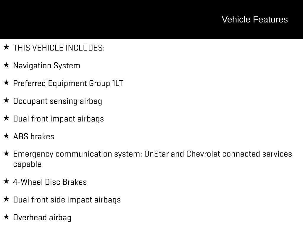THIS VEHICLE INCLUDES:, 4-Wheel Disc Brakes, ABS brakes, Alloy wheels, Dual front impact airbags, Dual front side impact airbags, Emergency communication system: OnStar and Chevrolet connected services capable, Heated Driver & Front Passenger Seats, Heated steering wheel, Low tire pressure warning, Navigation System, Occupant sensing airbag, Overhead airbag, Preferred Equipment Group 1LT, Security system, Telescoping steering wheel, Tilt steering wheel.