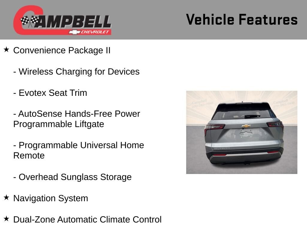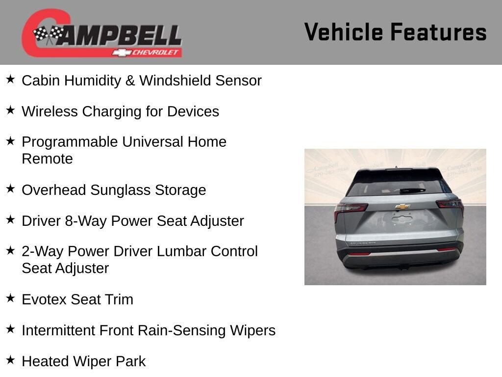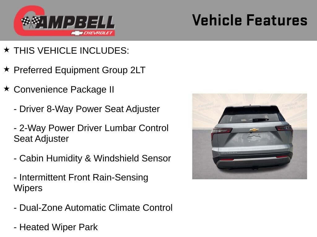 Discover the exceptional 2025 Chevrolet Equinox LT, a versatile and well-equipped SUV that's ready to elevate your driving experience. With its sleek gray exterior and advanced 1.5L DOHC engine paired with an 8-speed automatic transmission and all-wheel drive, this Equinox delivers a dynamic and efficient performance that will impress.- Convenience Package II- Preferred Equipment Group 2LT- Navigation System- Dual-Zone Automatic Climate Control- AutoSense Hands-Free Power Programmable Liftgate- Cabin Humidity & Windshield Sensor- Overhead Sunglass Storage- Programmable Universal Home Remote- Wireless Charging for Devices- 2-Way Power Driver Lumbar Control Seat Adjuster- Driver 8-Way Power Seat Adjuster- Evotex Seat Trim- Heated Wiper Park- Intermittent Front Rain-Sensing WipersElevate your driving experience with the impressive features of this 2025 Chevrolet Equinox LT. The Convenience Package II equips this SUV with a host of advanced technologies and conveniences, including a navigation system, dual-zone automatic climate control, and a hands-free power liftgate. Enjoy the added comfort of heated front seats, a heated steering wheel, and a cabin humidity sensor that helps maintain the perfect interior environment.This Equinox also boasts a comprehensive suite of safety features, including OnStar and Chevrolet connected services, ABS brakes, traction control, and a suite of airbags to protect you and your passengers. The 17-inch alloy wheels and roof rails add a touch of style and versatility, while the premium audio system with SiriusXM radio provides exceptional entertainment.With a city fuel economy of 24 MPG and a highway rating of 29 MPG, the 2025 Chevrolet Equinox LT delivers impressive efficiency without sacrificing power or capability. Whether you're commuting, running errands, or embarking on a road trip, this SUV is ready to handle it all with ease.Experience the exceptional value and features of the 2025 Chevrolet Equinox LT. Visit our showroom today and let us demonstrate how this versatile SUV can enhance your driving experience and meet your lifestyle needs. We're confident you'll be impressed by the Equinox's blend of performance, technology, and comfort.