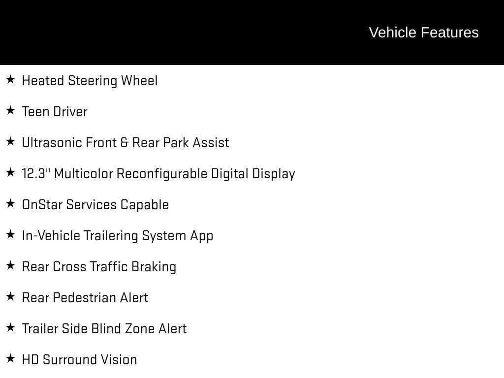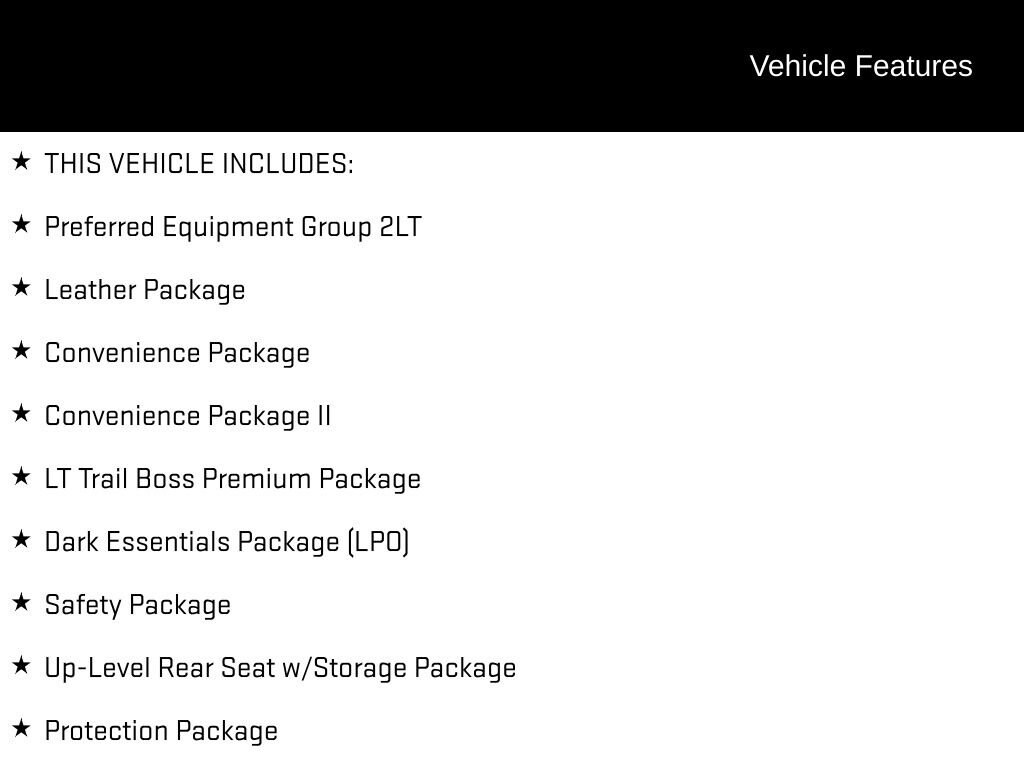 Discover the ultimate blend of power, capability, and style with the 2025 Chevrolet Silverado 1500 LT Trail Boss. This rugged and refined pickup is ready to take on any adventure, whether you're tackling the toughest terrain or cruising down the highway in comfort.Boasting an impressive array of features, this Silverado LT Trail Boss is more than just a workhorse. It's a true companion that will elevate your driving experience. Highlights include:- LT Trail Boss Premium Package- EcoTec3 5.3L V8 engine with Dynamic Fuel Management- Power sunroof- Leather-appointed front seats- Bose premium audio system- Heated steering wheel- Trailer camera provisions- And much moreThe powerful EcoTec3 V8 engine delivers 355 horsepower and 383 lb-ft of torque, providing the muscle you need for towing, hauling, or conquering off-road challenges. Paired with a smooth-shifting 8-speed automatic transmission and 4-wheel drive, this Silverado LT Trail Boss is ready to take on any task with confidence.Inside, the cabin is a sanctuary of refinement and technology. Sink into the comfortable leather-appointed front seats and enjoy the convenience of dual-zone automatic climate control, heated steering wheel, and premium Bose audio system. Stay connected with the Chevrolet Infotainment 3 Premium system, featuring a 12.3-inch reconfigurable digital display and seamless integration with your smartphone via Apple CarPlay and Android Auto.For those who demand more from their pickup, the Silverado LT Trail Boss delivers. The available LT Trail Boss Premium Package adds a host of premium features, including the Convenience Package II, Safety Package, Leather Package, and more. Elevate your driving experience with the power, capability, and style of this exceptional Silverado.Don't just take our word for it come experience the 2025 Chevrolet Silverado 1500 LT Trail Boss for yourself. Schedule a test drive today and discover the perfect blend of performance, technology, and refinement that will elevate your driving experience.