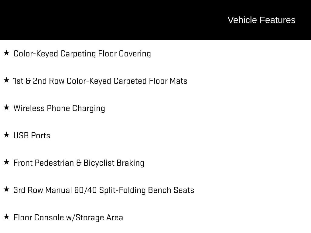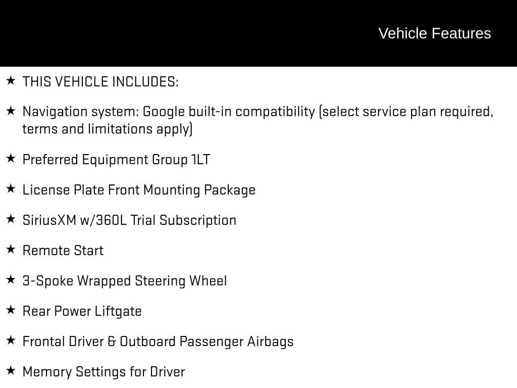 THIS VEHICLE INCLUDES:, 4WD, Black Leather, 1st & 2nd Row Color-Keyed Carpeted Floor Mats, 3-Spoke Wrapped Steering Wheel, 3rd Row Manual 60/40 Split-Folding Bench Seats, Color-Keyed Carpeting Floor Covering, Floor Console w/Storage Area, Front Pedestrian & Bicyclist Braking, Frontal Driver & Outboard Passenger Airbags, License Plate Front Mounting Package, Memory Settings for Driver, Navigation system: Google built-in compatibility (select service plan required, terms and limitations apply), Preferred Equipment Group 1LT, Rear Power Liftgate, Remote Start, SiriusXM w/360L Trial Subscription, USB Ports, Wireless Phone Charging.