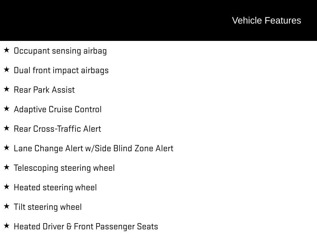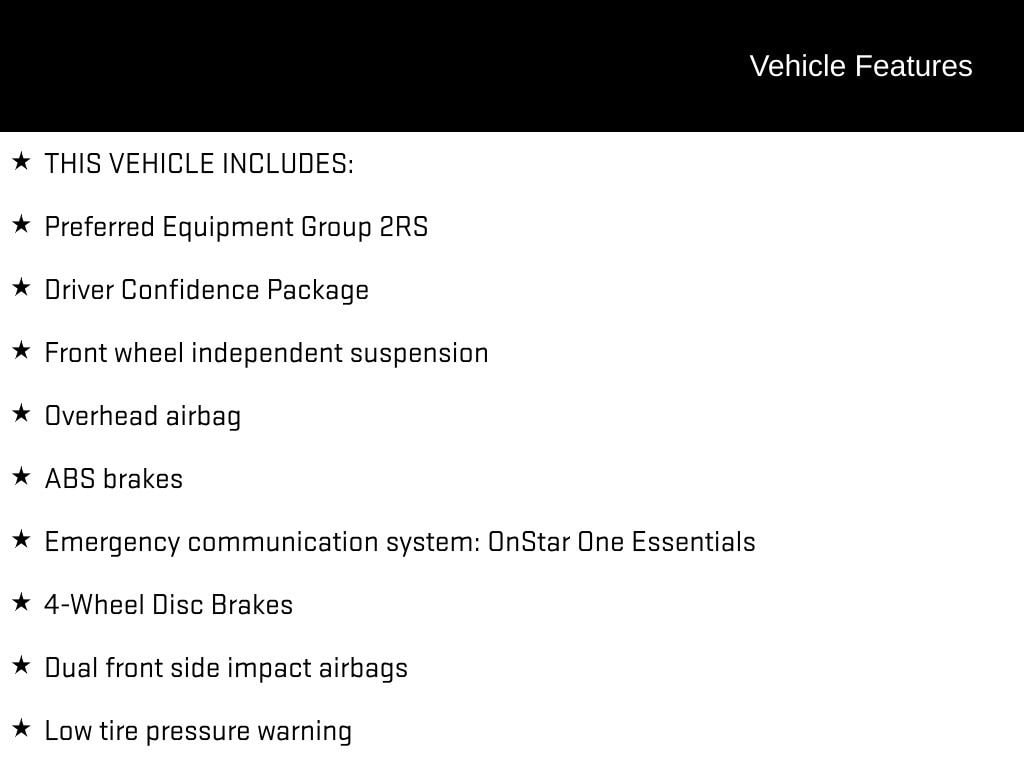 THIS VEHICLE INCLUDES:, 4-Wheel Disc Brakes, ABS brakes, Adaptive Cruise Control, Driver Confidence Package, Dual front impact airbags, Dual front side impact airbags, Emergency communication system: OnStar One Essentials, Front wheel independent suspension, Heated Driver & Front Passenger Seats, Heated front seats, Heated steering wheel, Lane Change Alert w/Side Blind Zone Alert, Low tire pressure warning, Occupant sensing airbag, Overhead airbag, Preferred Equipment Group 2RS, Rear Cross-Traffic Alert, Rear Park Assist, Telescoping steering wheel, Tilt steering wheel.
