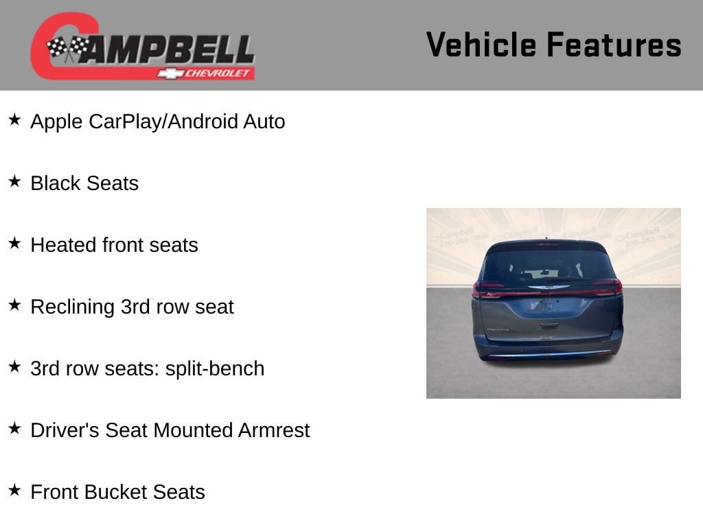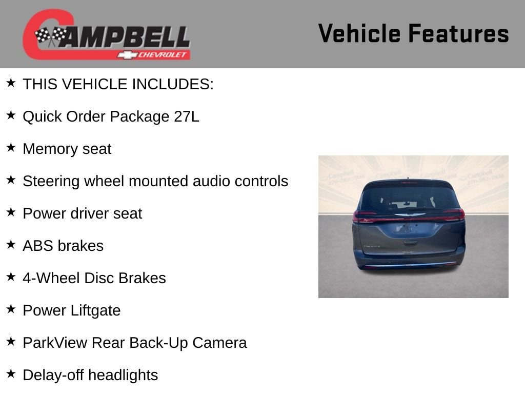 Discover the ultimate family-friendly ride with the 2023 Chrysler Pacifica Touring L. This exceptional minivan combines style, comfort, and cutting-edge technology, making it the perfect companion for your everyday adventures.- Gray Granite Crystal Metallic Clearcoat exterior- Quick Order Package 27L- Memory seat, Power driver seat, Steering wheel mounted audio controls, 4-Wheel Disc Brakes, ABS brakes, Power Liftgate, ParkView Rear Back-Up Camera, Delay-off headlights, Apple CarPlay/Android Auto, 3rd row seats: split-bench, Black Seats, Driver's Seat Mounted Armrest, Front Bucket Seats, Heated front seats, Reclining 3rd row seatStep inside and be captivated by the Pacifica's spacious and well-appointed interior. The 10.1 Uconnect 5 touchscreen display puts a wealth of connectivity and entertainment at your fingertips, seamlessly integrating your smartphone via Apple CarPlay and Android Auto. Enjoy the convenience of the power liftgate and the versatility of the split-folding third-row seats, making it easy to accommodate your family's needs.Under the hood, the 3.6L V6 engine delivers a smooth and efficient ride, offering an impressive 19 city / 28 highway MPG. The 9-speed automatic transmission and front-wheel-drive system provide a confident and responsive driving experience, ensuring you navigate the roads with ease.Safety is paramount, and the Pacifica Touring L is equipped with a suite of advanced driver-assistance technologies, including ABS brakes, Electronic Stability Control, and a ParkView Rear Back-Up Camera. These features work together to provide you and your loved ones with the utmost protection.Whether you're embarking on a family road trip, shuttling the kids to their activities, or simply enjoying your daily commute, the 2023 Chrysler Pacifica Touring L is the ideal choice. Experience the perfect blend of style, functionality, and technology that will elevate your driving experience.We invite you to visit our showroom and take this exceptional minivan for a test drive. Let us demonstrate how the Pacifica Touring L can transform your daily driving into an exceptional journey.