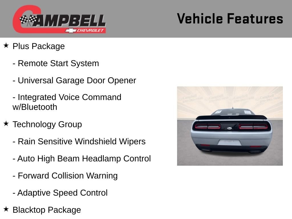 The Blacktop Package and Plus Package further enhance the Challenger's bold style and premium amenities, while the Technology Group adds advanced safety features like Forward Collision Warning and Auto High Beam Headlamp Control.