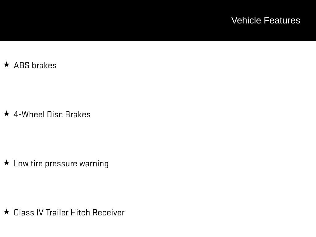 THIS VEHICLE INCLUDES:, 4WD, 4-Wheel Disc Brakes, ABS brakes, Auxiliary Transmission Oil Cooler, Class IV Trailer Hitch Receiver, Dual front impact airbags, Dual front side impact airbags, Front wheel independent suspension, Low tire pressure warning, Occupant sensing airbag, Overhead airbag, Power steering, Trailer Tow Package, Upgraded Front Stabilizer Bar.