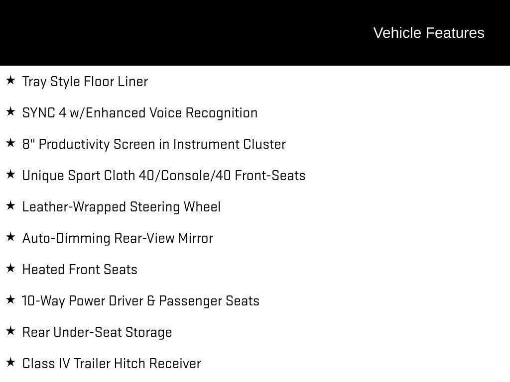 Inside, you'll find a wealth of convenient features that make every drive a pleasure. The Dual Zone Automatic Temperature Control keeps you and your passenger comfortable, while the Intelligent Access with Push Button Start and Remote Start System add a level of convenience that you'll appreciate. The 8-inch Productivity Screen in the instrument cluster provides vital information at a glance, and the SYNC 4 infotainment system with Enhanced Voice Recognition keeps you connected and entertained.