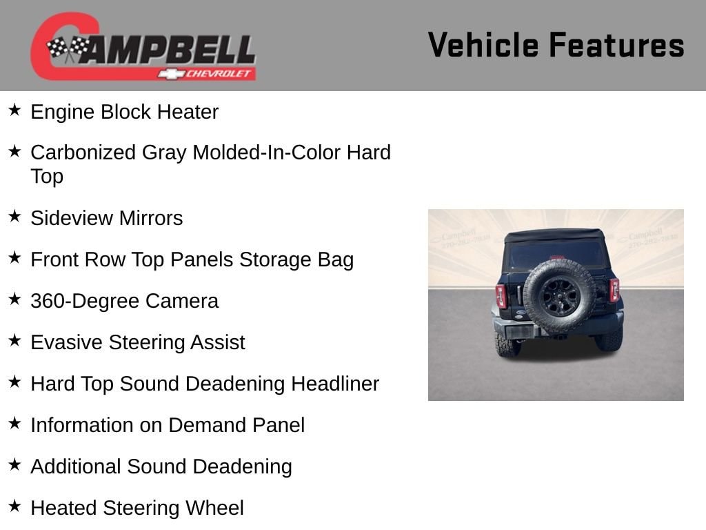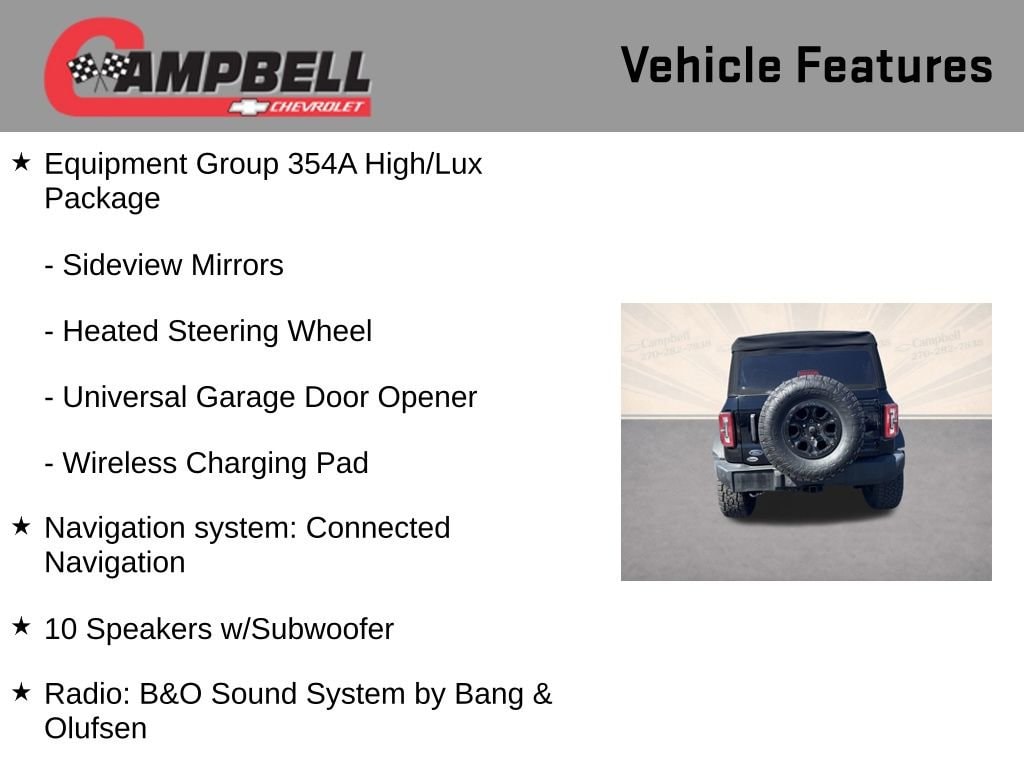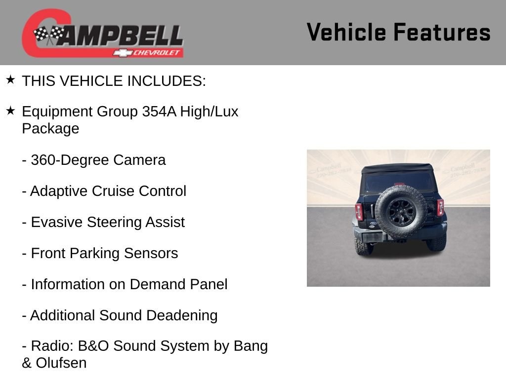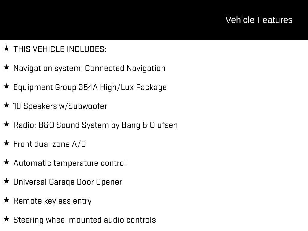 THIS VEHICLE INCLUDES:, 10 Speakers w/Subwoofer, 360-Degree Camera, 4-Wheel Disc Brakes, ABS brakes, Adaptive Cruise Control, Additional Sound Deadening, Alloy wheels, Auto High-beam Headlights, Automatic temperature control, Carbonized Gray Molded-In-Color Hard Top, Dual front impact airbags, Dual front side impact airbags, Emergency communication system: 911 Assist, Engine Block Heater, Equipment Group 354A High/Lux Package, Evasive Steering Assist, Front Bucket Seats, Front Center Armrest, Front dual zone A/C, Front Parking Sensors, Front Row Top Panels Storage Bag, Front wheel independent suspension, Hard Top Sound Deadening Headliner, Heated front seats, Heated Leather-Trimmed/Vinyl Bucket Seats, Heated Steering Wheel, Information on Demand Panel, Low tire pressure warning, Navigation system: Connected Navigation, Occupant sensing airbag, Overhead airbag, Power steering, Power windows, Radio: B&O Sound System by Bang & Olufsen, Rear-Window Defroster & Washer, Remote keyless entry, Security system, Sideview Mirrors, Speed control, Split folding rear seat, Steering wheel mounted audio controls, Telescoping steering wheel, Tilt steering wheel, Universal Garage Door Opener, Wheel Lock Kit (DIO), Wheels: 17 Black High Gloss-Painted Aluminum, Wireless Charging Pad.
