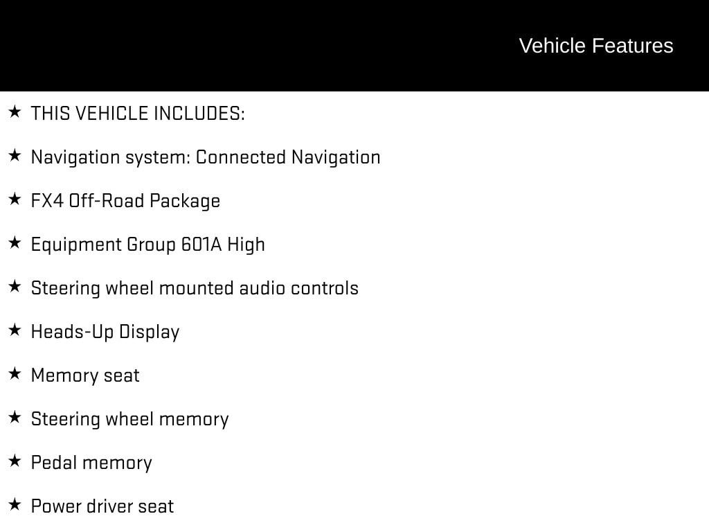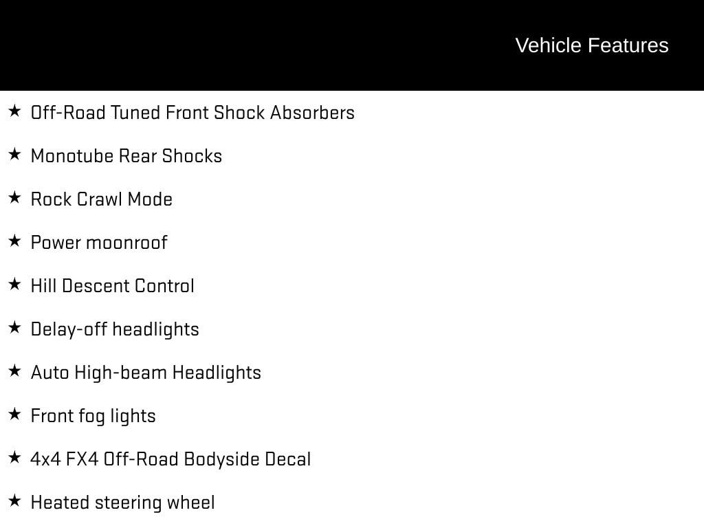 Exterior styling is equally impressive, with the 4x4 FX4 Off-Road Bodyside Decal, Chrome Wheels, and Power Moonroof adding a touch of rugged elegance. The Heated Steering Wheel, Heated Front and Rear Seats, and Ventilated Front Seats keep you comfortable in any weather.