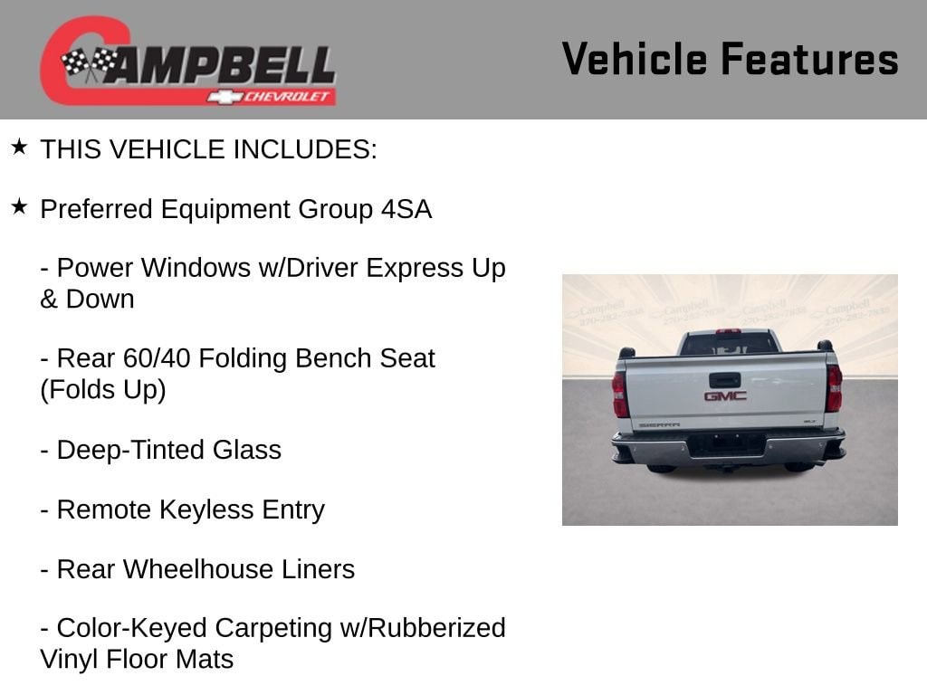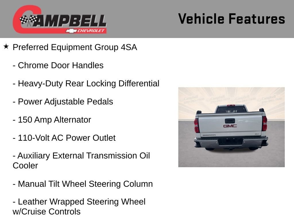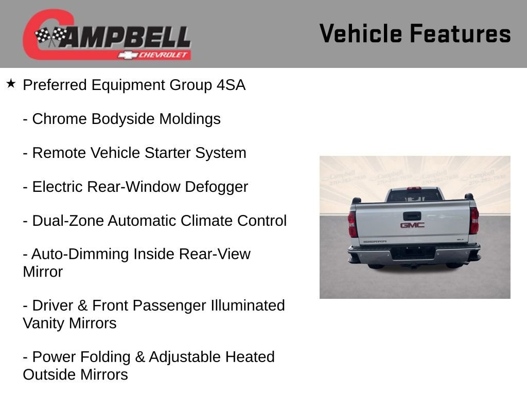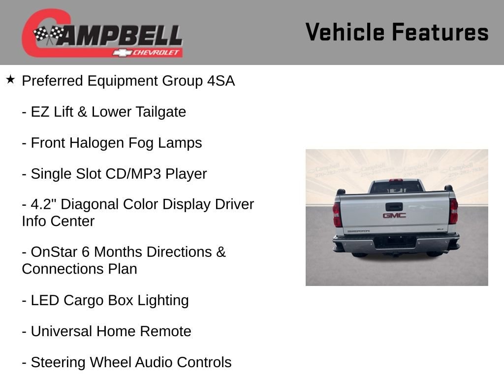 Slip behind the wheel of this Sierra 1500 SLT and discover the perfect blend of strength, technology, and sophistication. The heated and cooled perforated leather-appointed front bucket seats provide unparalleled comfort, while the 8 diagonal color touch screen navigation with IntelliLink keeps you connected and in control. With the Off-Road Suspension Package, you'll have the capability to tackle any terrain with confidence.