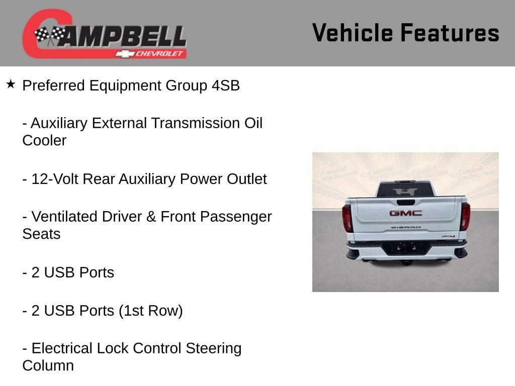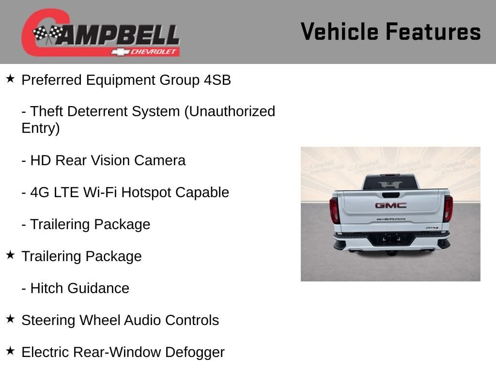 The Preferred Equipment Group 4SB and Trailering Package further enhance the Sierra 1500 AT4's capabilities, providing you with a comprehensive suite of features designed to make your life easier. Enjoy the convenience of the Remote Vehicle Starter System, the security of the Theft Deterrent System, and the peace of mind that comes with the ProGrade Trailering System and Integrated Trailer Brake Controller.