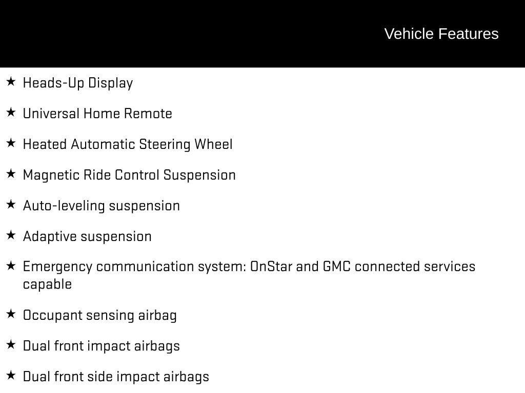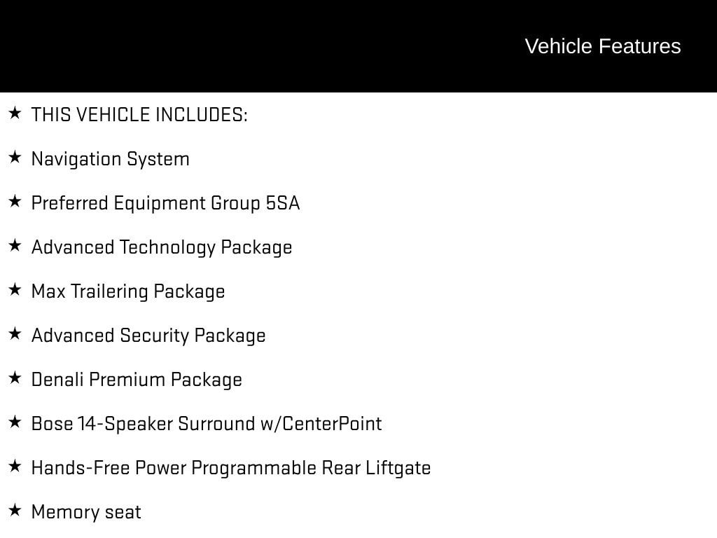 THIS VEHICLE INCLUDES:, 4WD, 12-Way Power Seat Adjusters, 15 Diagonal Multi-Color Head-Up Display, 2 Presets For Outside Rearview Mirrors, 3rd Row 60/40 Power-Folding Split-Bench Seat, 4-Wheel Disc Brakes, ABS brakes, Adaptive Cruise Control, Adaptive suspension, Advanced Security Package, Advanced Technology Package, Auto-leveling suspension, Bose 14-Speaker Surround w/CenterPoint, Bright Front & Rear Door Sill Plates, Chrome Door Handles w/Body-Color Strip, Denali Premium Package, Dual Exhaust System, Dual front impact airbags, Dual front side impact airbags, Dual-Pane Panoramic Power Sunroof, Emergency communication system: OnStar and GMC connected services capable, Enhanced Automatic Emergency Braking, Extra Capacity Cooling System, Galvano Bodyside Moldings, Glass Breakage Sensor, Hands-Free Power Programmable Rear Liftgate, HD Surround Vision, Heads-Up Display, Heated & Ventilated Driver & Front Passenger Seats, Heated 2nd Row Outboard Position Seats, Heated Automatic Steering Wheel, Heated Driver & Front Passenger Seats, Hill Descent Control, Inside Rear-View Auto-Dimming Mirror, Inside Rearview Auto-Dimming Rear Camera Mirror, Low tire pressure warning, Magnetic Ride Control Suspension, Max Trailering Package, Memory seat, Navigation System, Occupant sensing airbag, Outside Heated Power-Adjustable Mirrors, Overhead airbag, Power Liftgate, Power Release 2nd Row Bucket Seats, Power Tilt & Telescopic Steering Column, Power-Retractable Assist Steps, Preferred Equipment Group 5SA, Rear Camera Mirror Washer, Rear Pedestrian Alert, Safety Alert Seat, Theft-Deterrent Alarm System, Universal Home Remote, Vehicle Inclination Sensor, Vehicle Interior Movement Sensor.