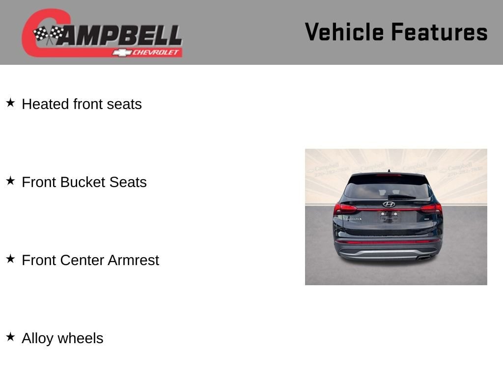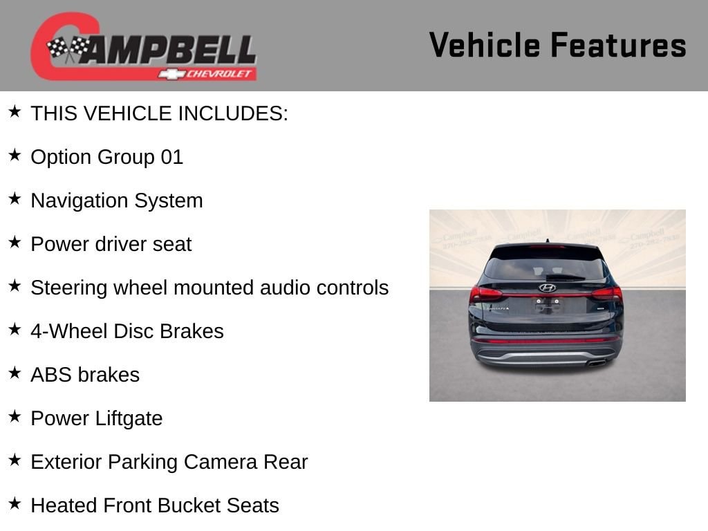 Experience the exceptional 2023 Hyundai Santa Fe SEL, a versatile and well-equipped SUV that seamlessly blends style, performance, and advanced technology. This stunning Black beauty is ready to elevate your driving experience and meet the demands of your active lifestyle. Navigation System Power driver seat Steering wheel mounted audio controls 4-Wheel Disc Brakes ABS brakes Power Liftgate Exterior Parking Camera Rear Front Bucket Seats Front Center Armrest Heated Front Bucket Seats Heated front seats Alloy wheelsPowered by a robust 2.5L I4 engine paired with an 8-Speed Automatic with SHIFTRONIC transmission, the Santa Fe SEL delivers exceptional performance and efficiency, with an impressive 22 city/25 highway MPG. The available All-Wheel Drive system ensures confident handling in a variety of road conditions, making this SUV a versatile companion for your daily commute or weekend adventures.Step inside the well-appointed cabin and experience the thoughtful design and premium amenities that set the Santa Fe SEL apart. Enjoy the comfort of heated front seats, the convenience of a power liftgate, and the peace of mind provided by advanced safety features like Blind Spot Monitoring and Rear Cross-Traffic Alert. The intuitive infotainment system, complete with Apple CarPlay and Android Auto integration, keeps you connected and entertained on the go.Whether you're transporting your family, tackling your weekend errands, or embarking on a road trip, the 2023 Hyundai Santa Fe SEL is ready to rise to the occasion. With its spacious interior, ample cargo capacity, and a host of advanced technologies, this SUV is a true embodiment of modern versatility and style.We invite you to experience the exceptional 2023 Hyundai Santa Fe SEL for yourself. Schedule a test drive today and discover the perfect balance of performance, comfort, and convenience that this remarkable vehicle has to offer. We're confident that once you get behind the wheel, you'll be captivated by its exceptional capabilities and refined driving dynamics.