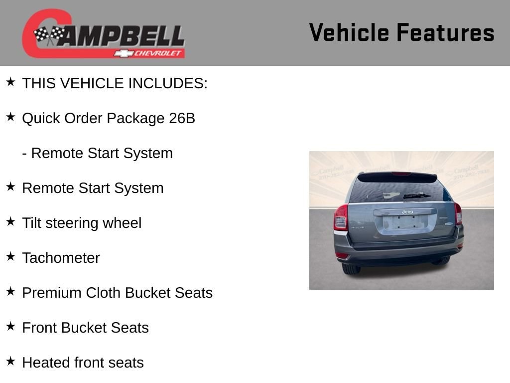 Powered by a 2.4L I4 DOHC 16V Dual VVT engine and equipped with a CVT and 4WD, this Compass Latitude delivers an impressive 21 city/26 highway MPG, making it a practical choice for your daily commute and weekend adventures. The quick-order package includes a host of desirable features, elevating your driving experience.