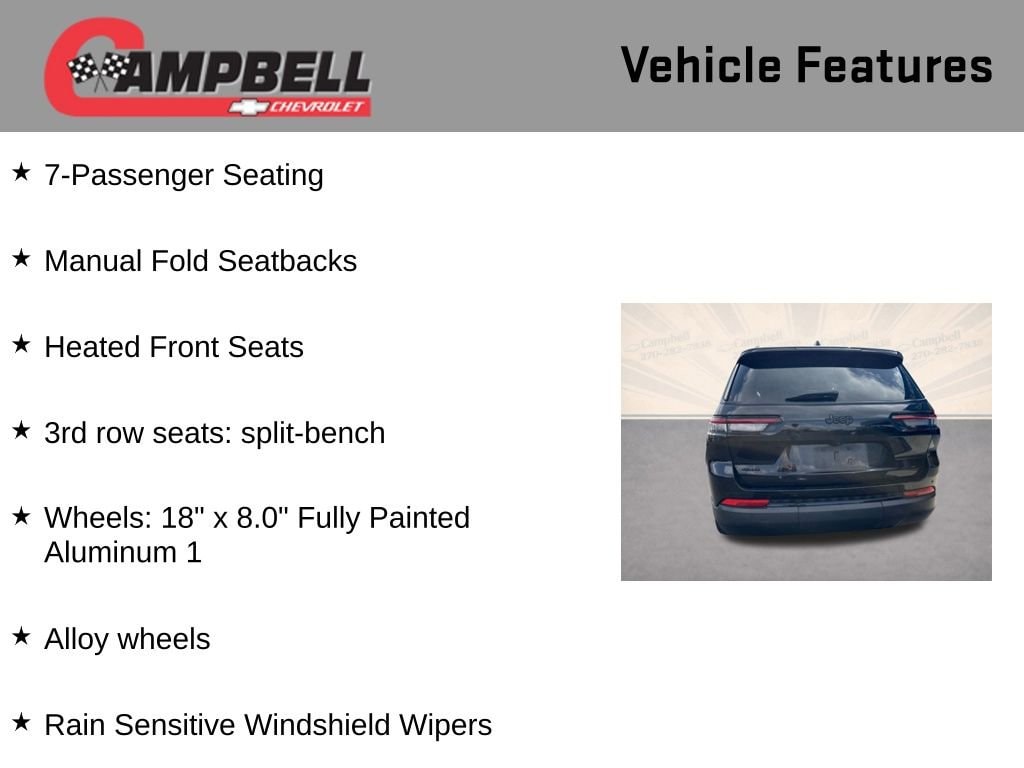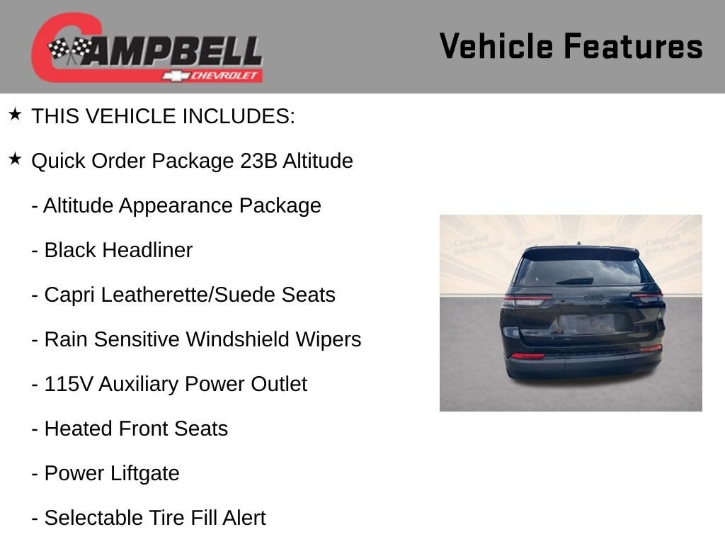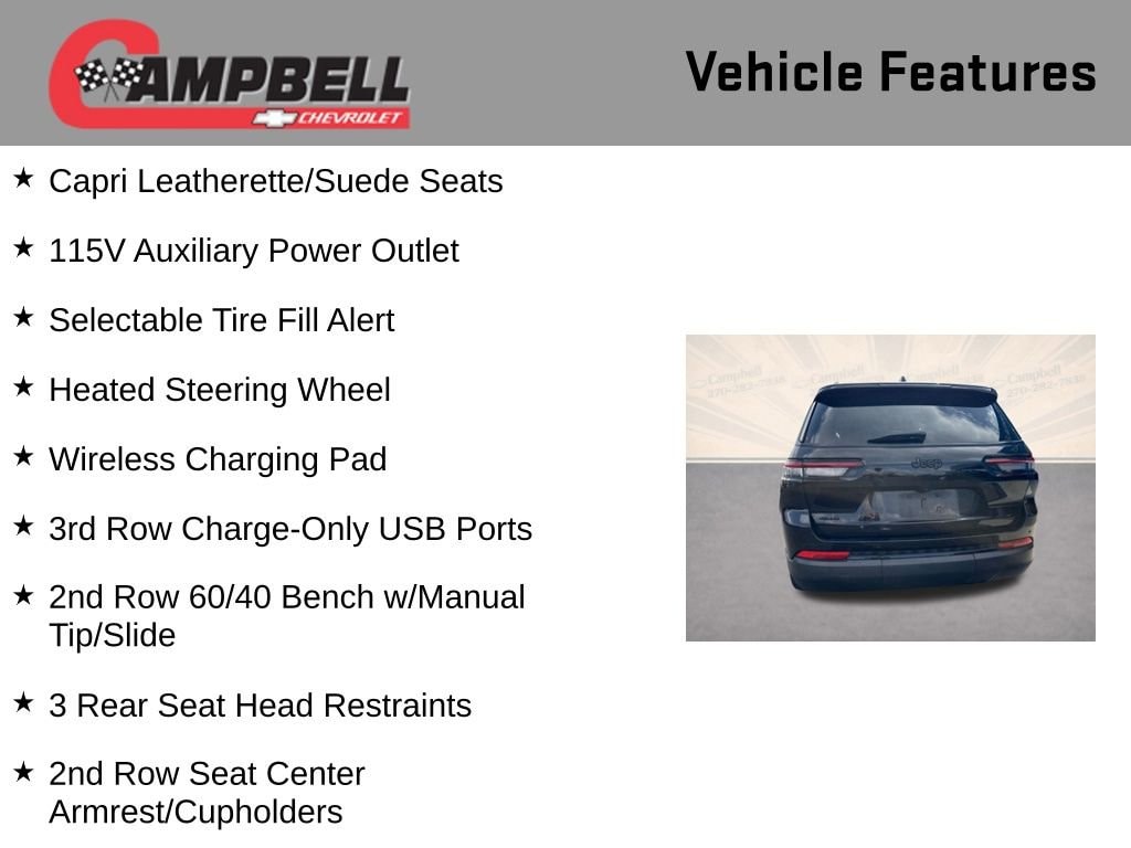 With seating for up to 7 and a versatile 60/40 split-folding second-row bench, the Grand Cherokee L Altitude offers ample space for passengers and cargo alike. The Selectable Tire Fill Alert and 2nd Row Seat Center Armrest/Cupholders add thoughtful convenience to every journey.