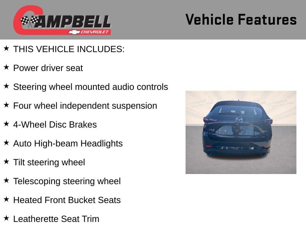 This CX-5 is equipped with a 2.5L 4-Cylinder DOHC engine and 6-Speed Automatic transmission with AWD, delivering an impressive balance of power and efficiency. With an EPA-estimated 23 city/29 highway MPG, you'll enjoy the freedom to explore without frequent stops at the pump.