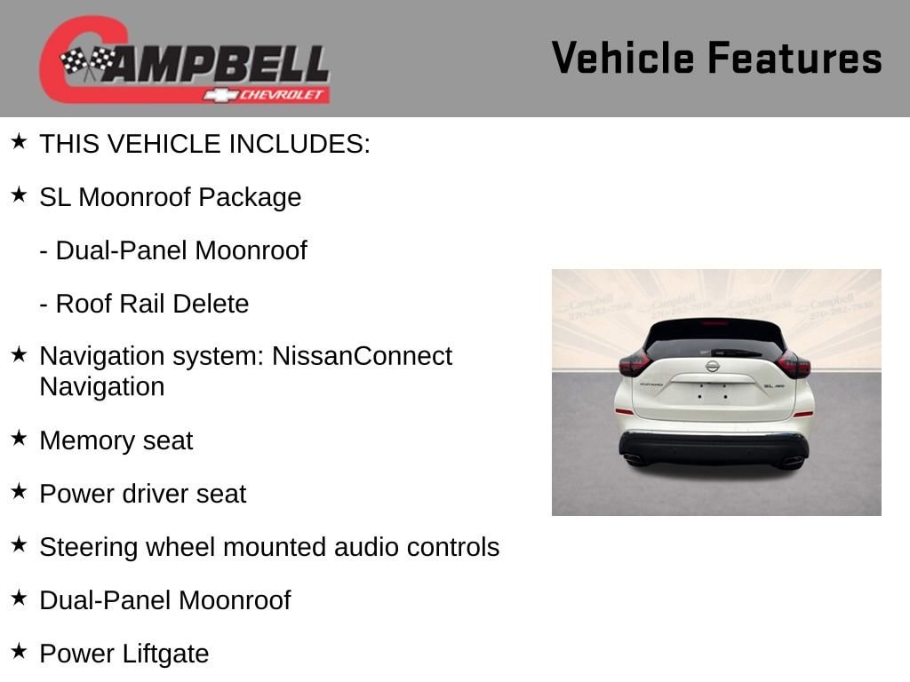 Meticulously equipped, the Murano SL includes a remarkable array of features that elevate your driving experience: