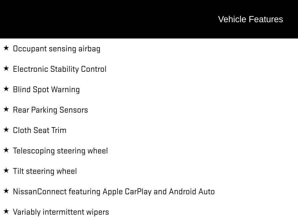 THIS VEHICLE INCLUDES:, CVT with Xtronic, Charcoal Cloth, ABS brakes, Blind Spot Warning, Cloth Seat Trim, Dual front impact airbags, Dual front side impact airbags, Electronic Stability Control, Four wheel independent suspension, Knee airbag, Low tire pressure warning, NissanConnect featuring Apple CarPlay and Android Auto, Occupant sensing airbag, Overhead airbag, Rear Parking Sensors, Rear side impact airbag, Steering wheel mounted audio controls, Telescoping steering wheel, Tilt steering wheel, Variably intermittent wipers.