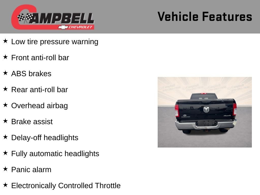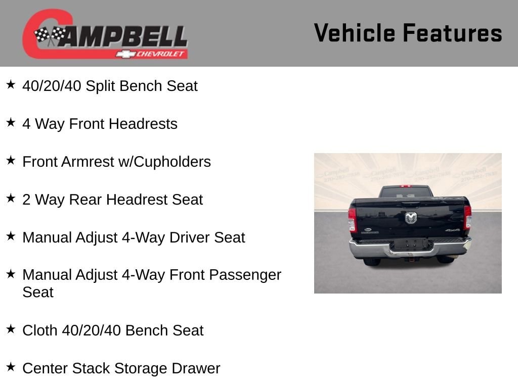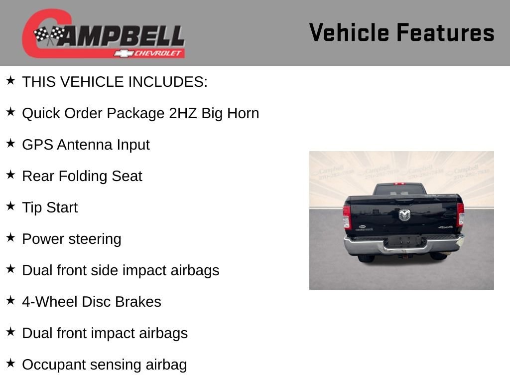 THIS VEHICLE INCLUDES:, 2 Way Rear Headrest Seat, 4 Way Front Headrests, 4-Wheel Disc Brakes, 40/20/40 Split Bench Seat, ABS brakes, Brake assist, Center Stack Storage Drawer, Cloth 40/20/40 Bench Seat, Delay-off headlights, Dual front impact airbags, Dual front side impact airbags, Electronically Controlled Throttle, Front anti-roll bar, Front Armrest w/Cupholders, Fully automatic headlights, GPS Antenna Input, Low tire pressure warning, Manual Adjust 4-Way Driver Seat, Manual Adjust 4-Way Front Passenger Seat, Occupant sensing airbag, Overhead airbag, Panic alarm, Power steering, Quick Order Package 2HZ Big Horn, Rear anti-roll bar, Rear Folding Seat, Tip Start.