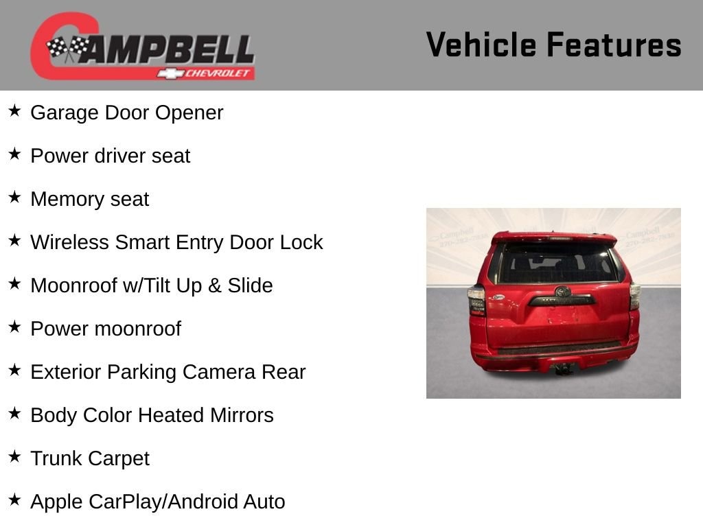 Elevate your driving experience with the premium features that set this 4Runner apart. Enjoy the convenience of the Navigation System, the comfort of the Heated and Ventilated Front Seats, and the peace of mind that comes with the Exterior Parking Camera Rear. With its impressive 4WD capabilities, this SUV is ready to tackle any terrain, whether you're exploring the great outdoors or navigating the city streets.