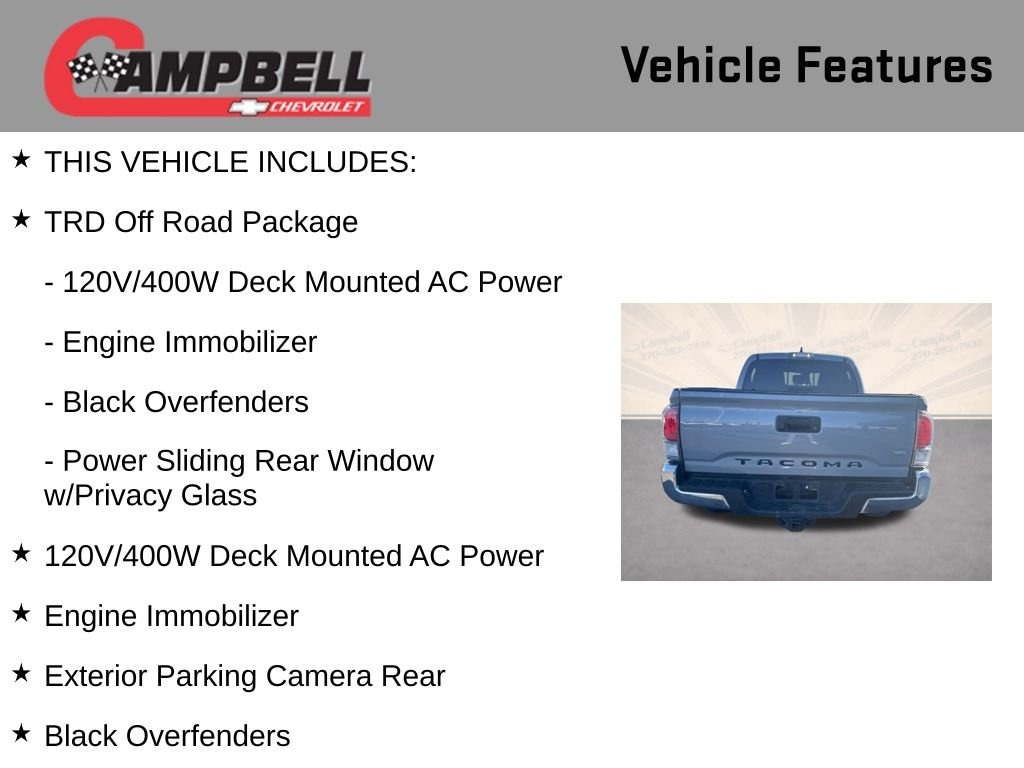 Boasting a powerful 3.5L V6 engine that delivers 278 horsepower, the Tacoma TRD Off-Road is built to handle even the toughest terrain. With its 4WD system and a host of off-road-focused features, this truck is the perfect choice for the adventurous spirit.